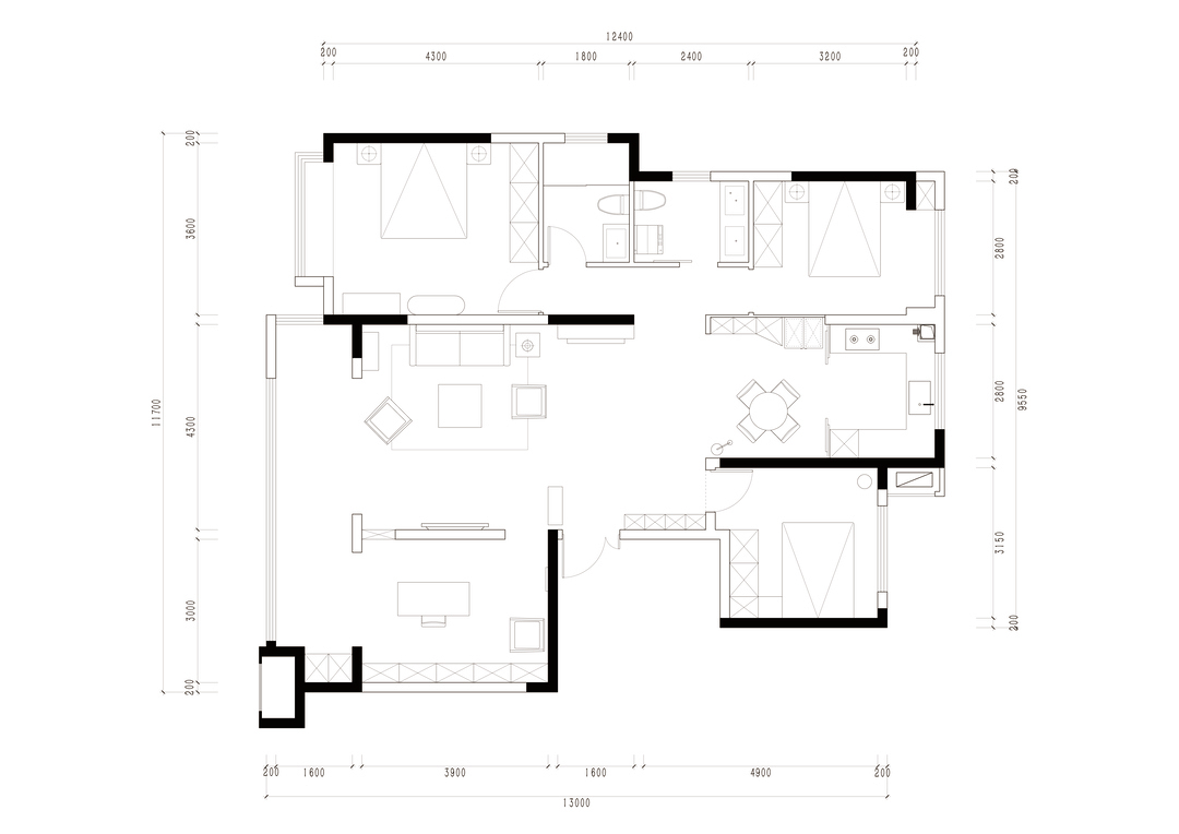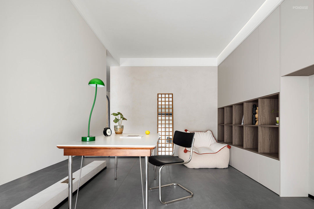 进门墙体调整,增加储物空间,厨房部分功能外扩至餐厅。公共书房和客厅联通,隔而不断。