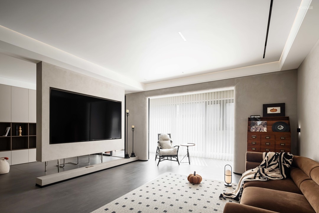 电视墙做成悬浮形式,使得客厅和书房隔而不断。在大空间中形成回游动线,增加空间的趣味性。