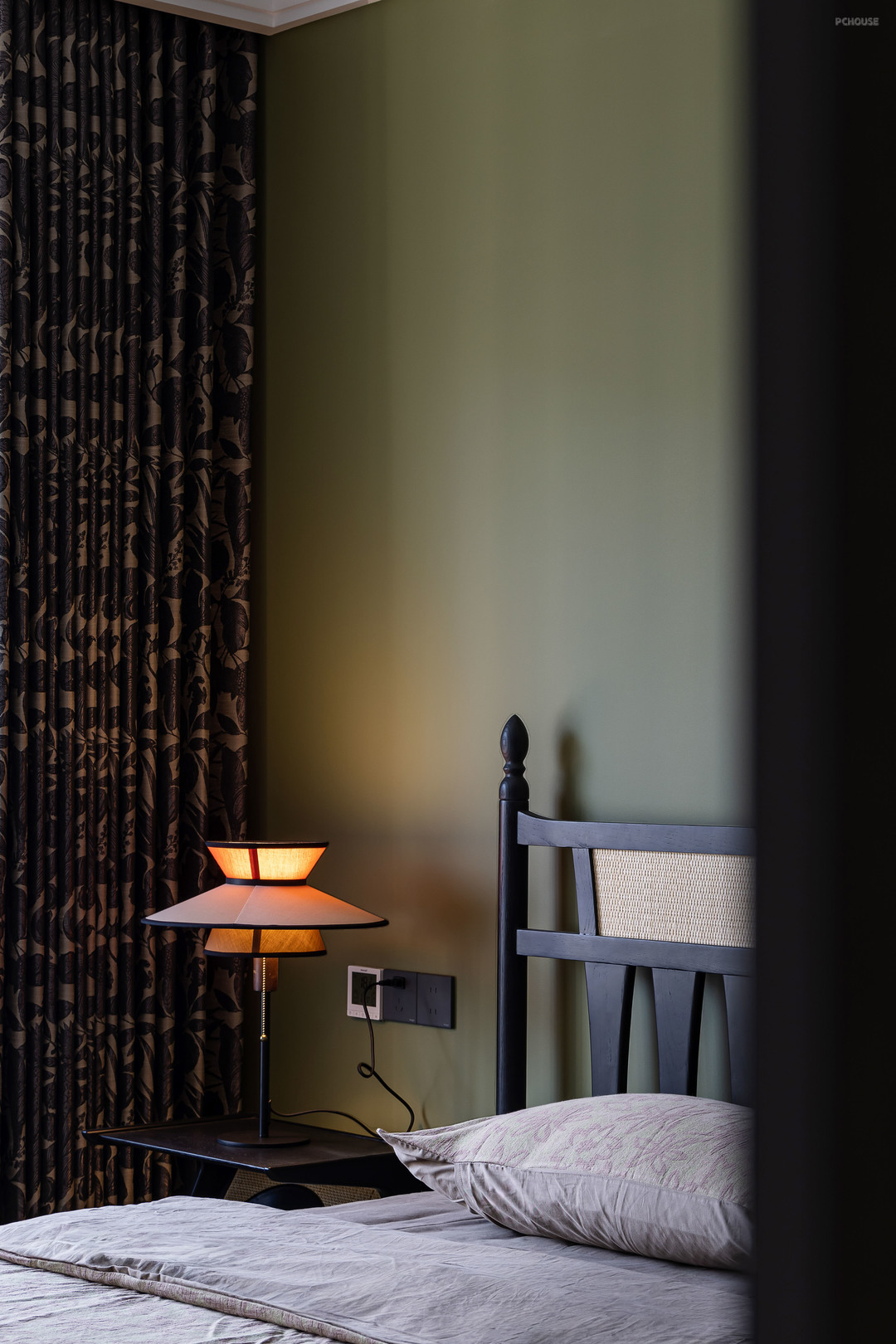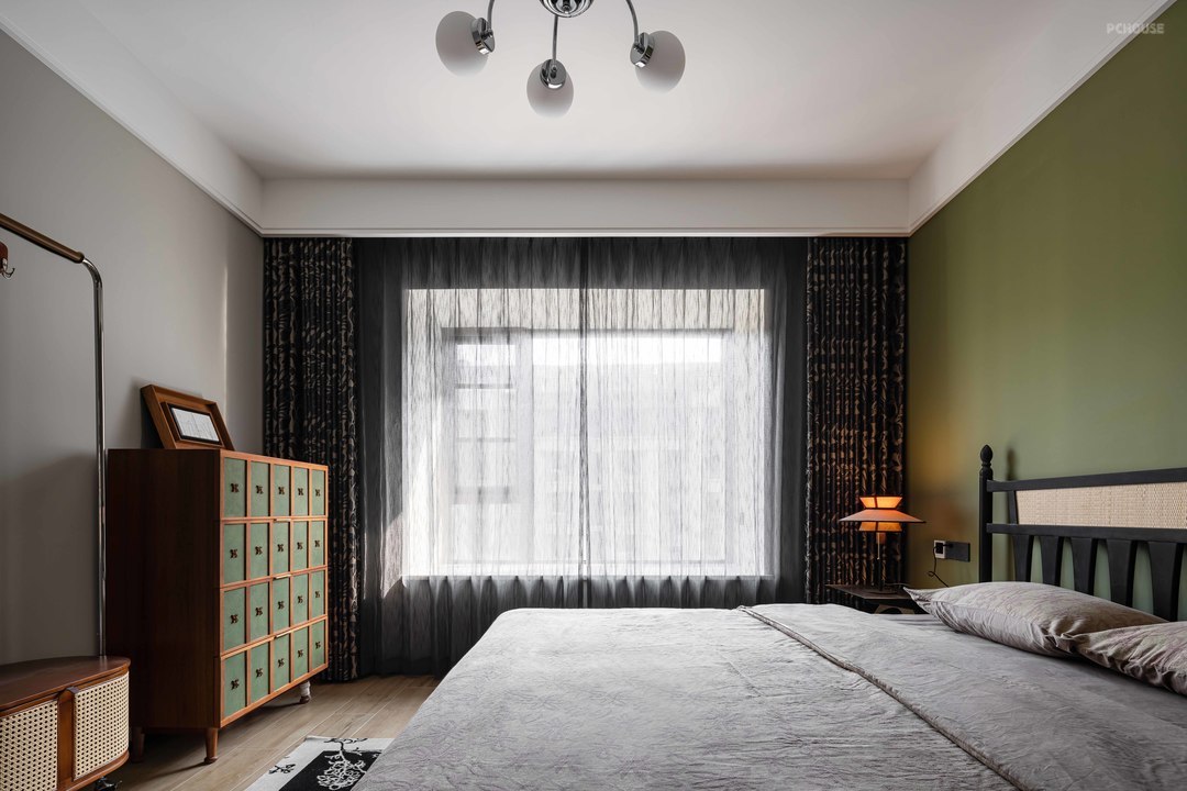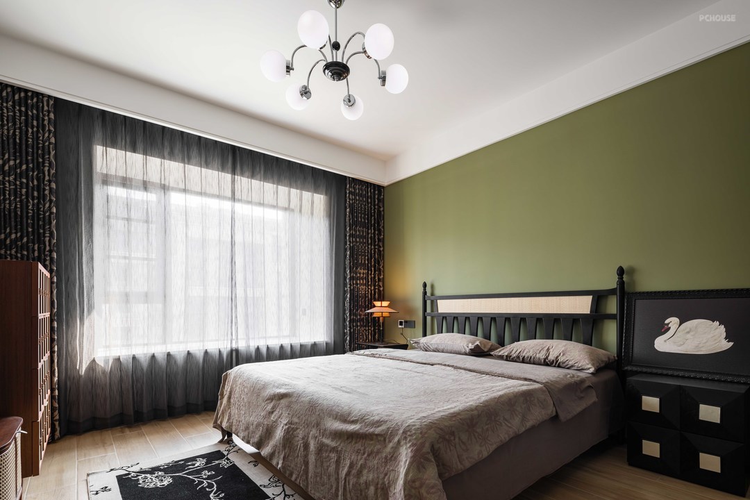 主卧室整体色调,延续了客厅的搭配方式。一面绿色绚烂了整个空间。配以复古的床和斗柜。精致且个性。