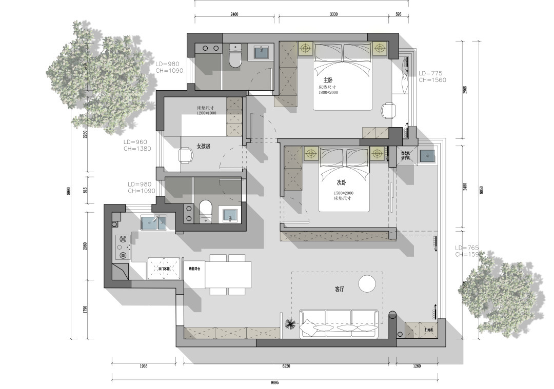前言: 这是一个精装改造项目,客户委托我们对精装房进行适度的改造,要求成本小,但是能出法式的效果。这对我们而言也是一项挑战。