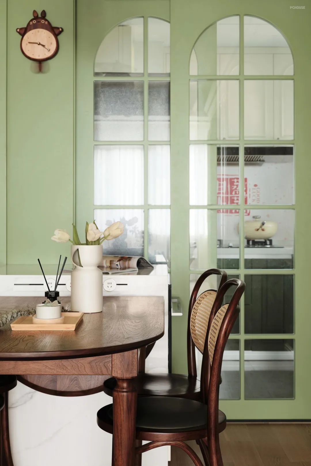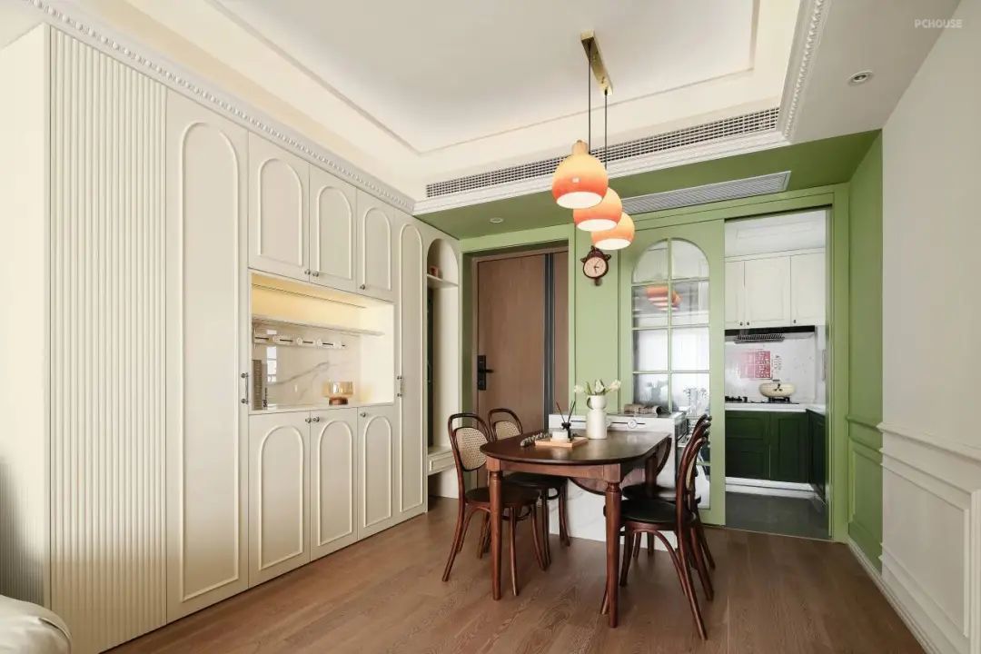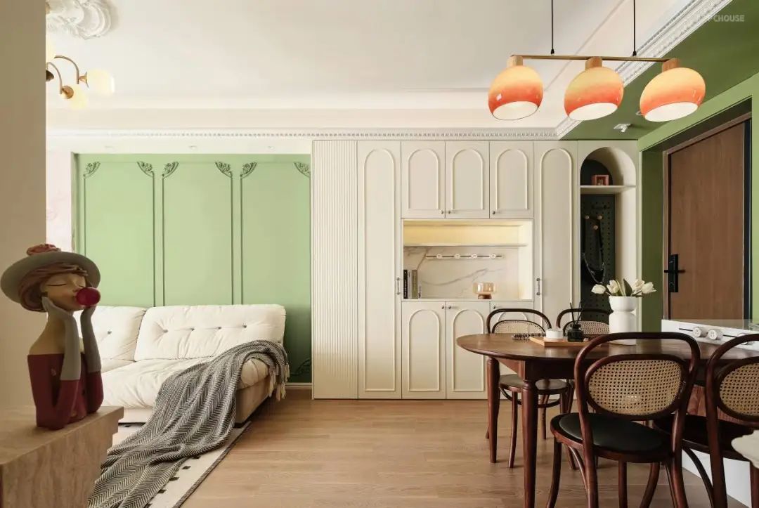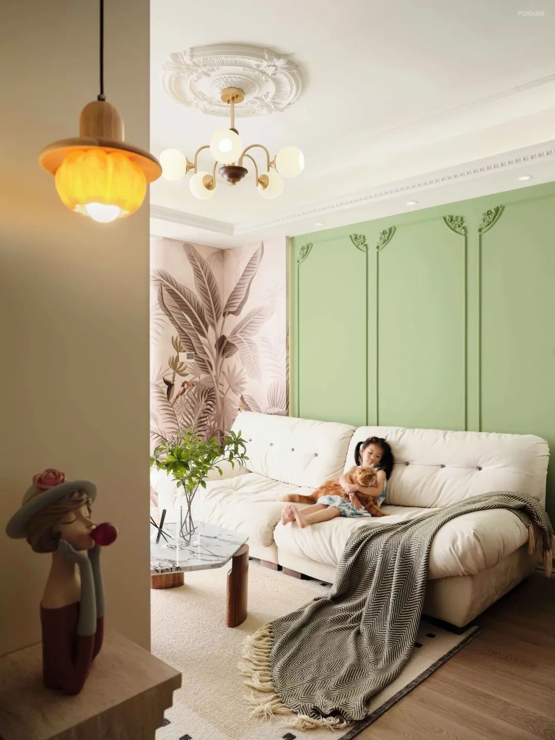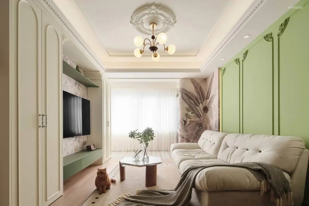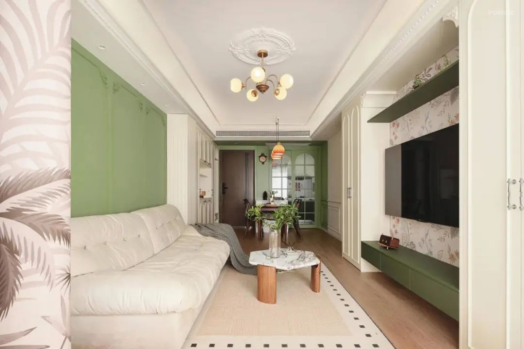 客厅是以绿色为主色调,搭配上奶油白色,给人一种浪漫的法式感。