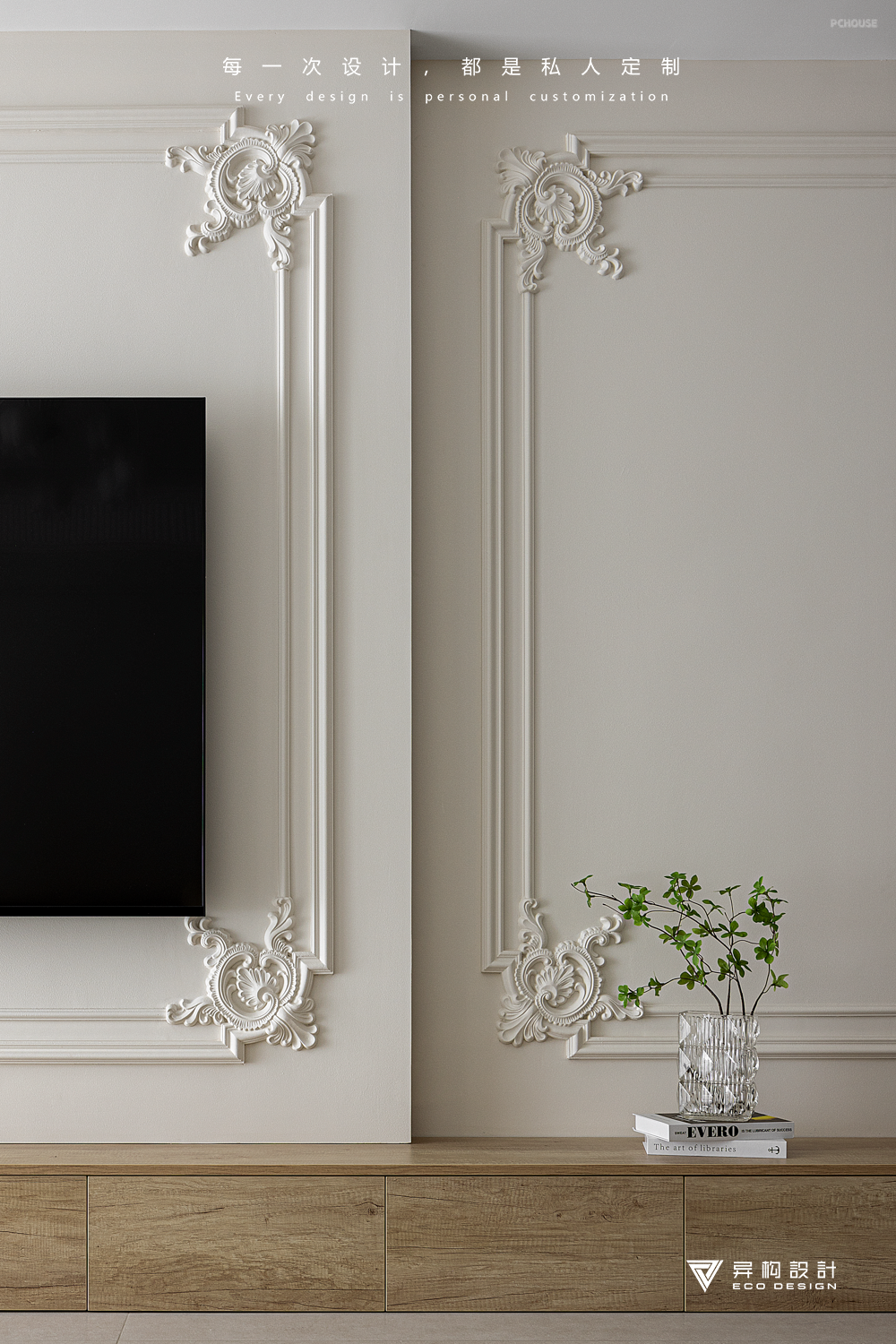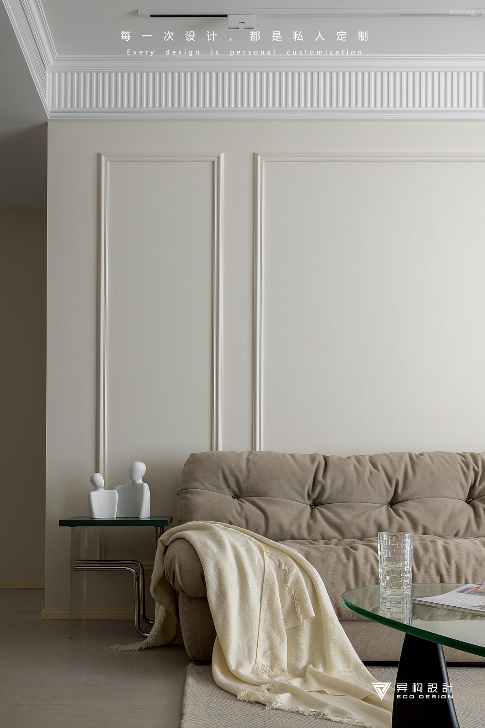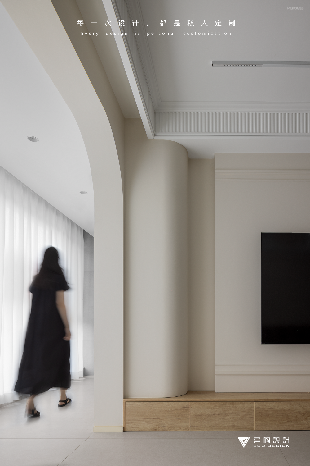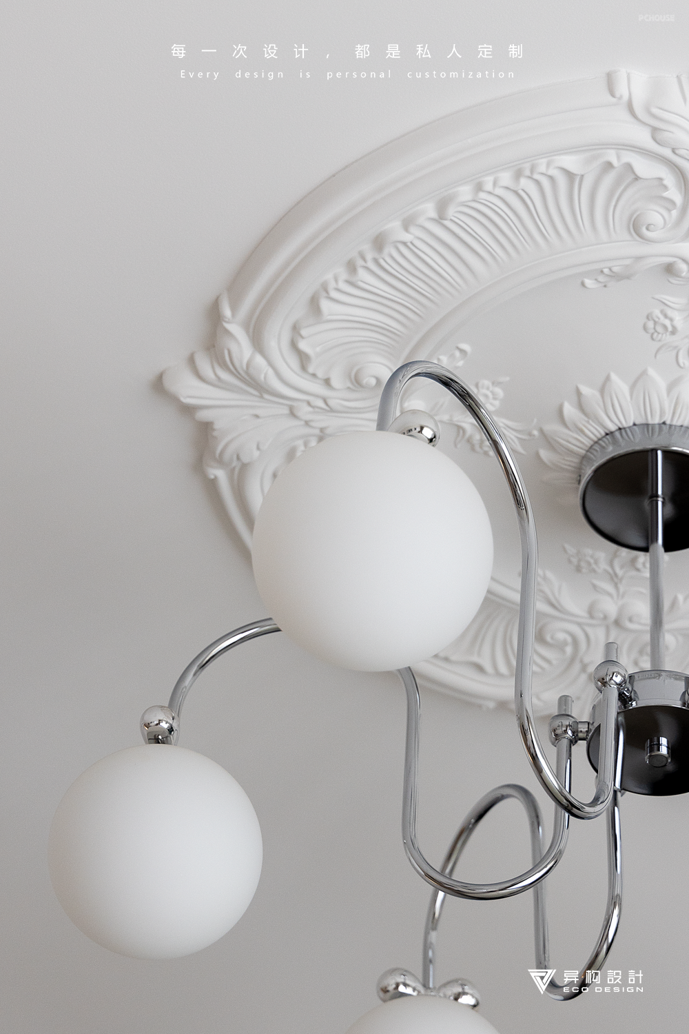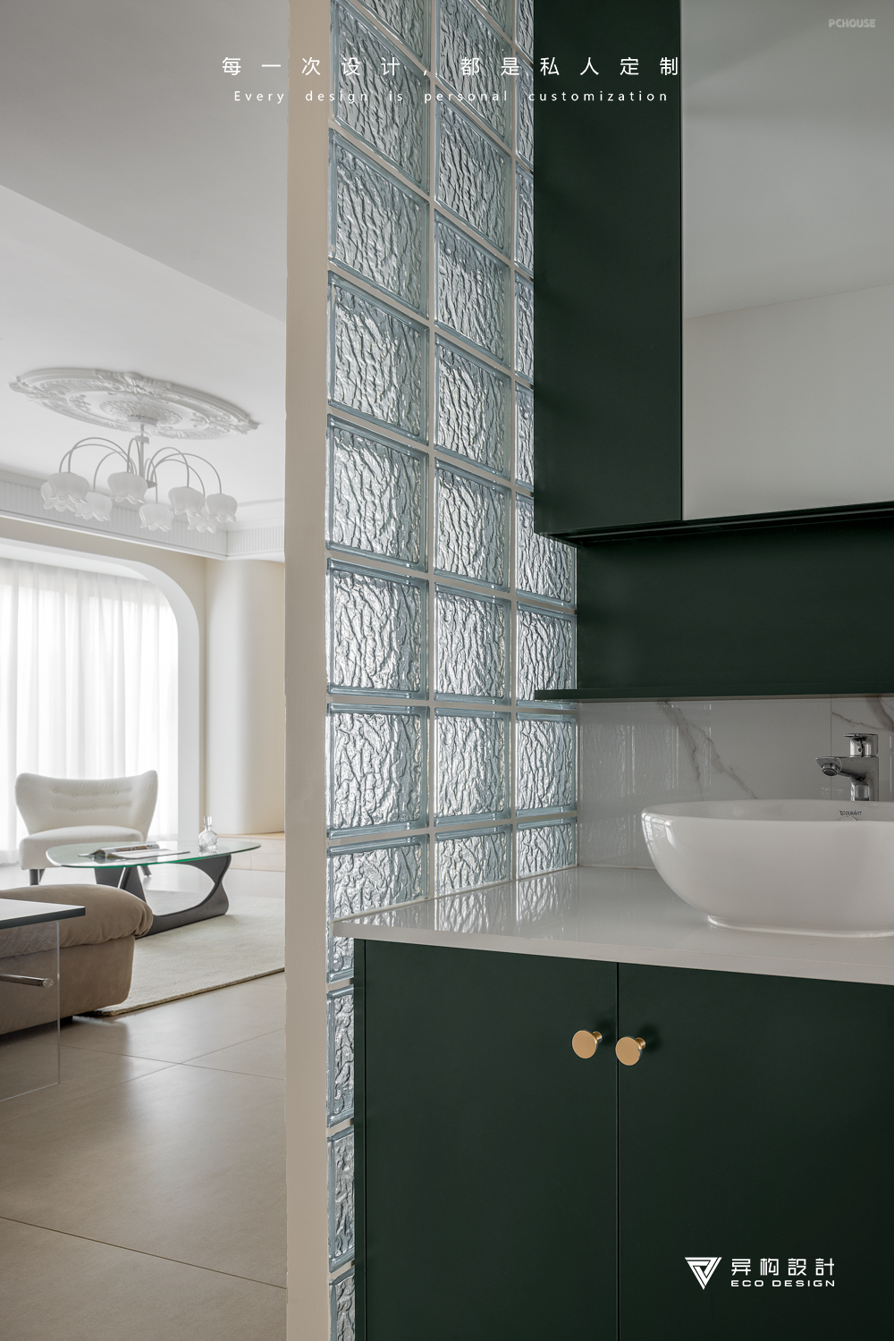 设计中主要改造部分是厨房旁边的生活阳台,以及客卫比较小将台盆外移缓解空间拥挤,同时增加空间层次感,最后在硬装上采用弧形线条以及石膏线条来增强法式氛围感。