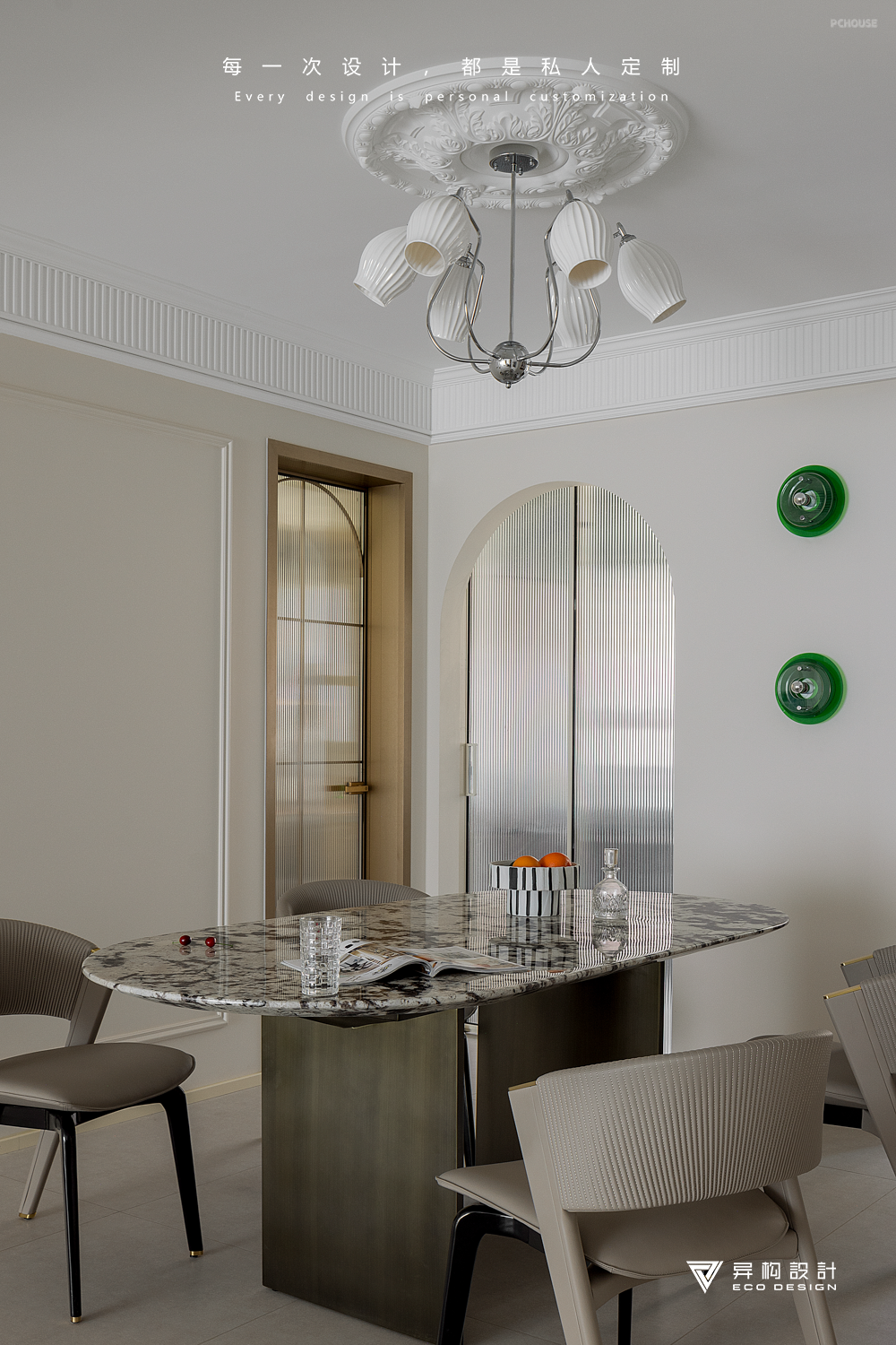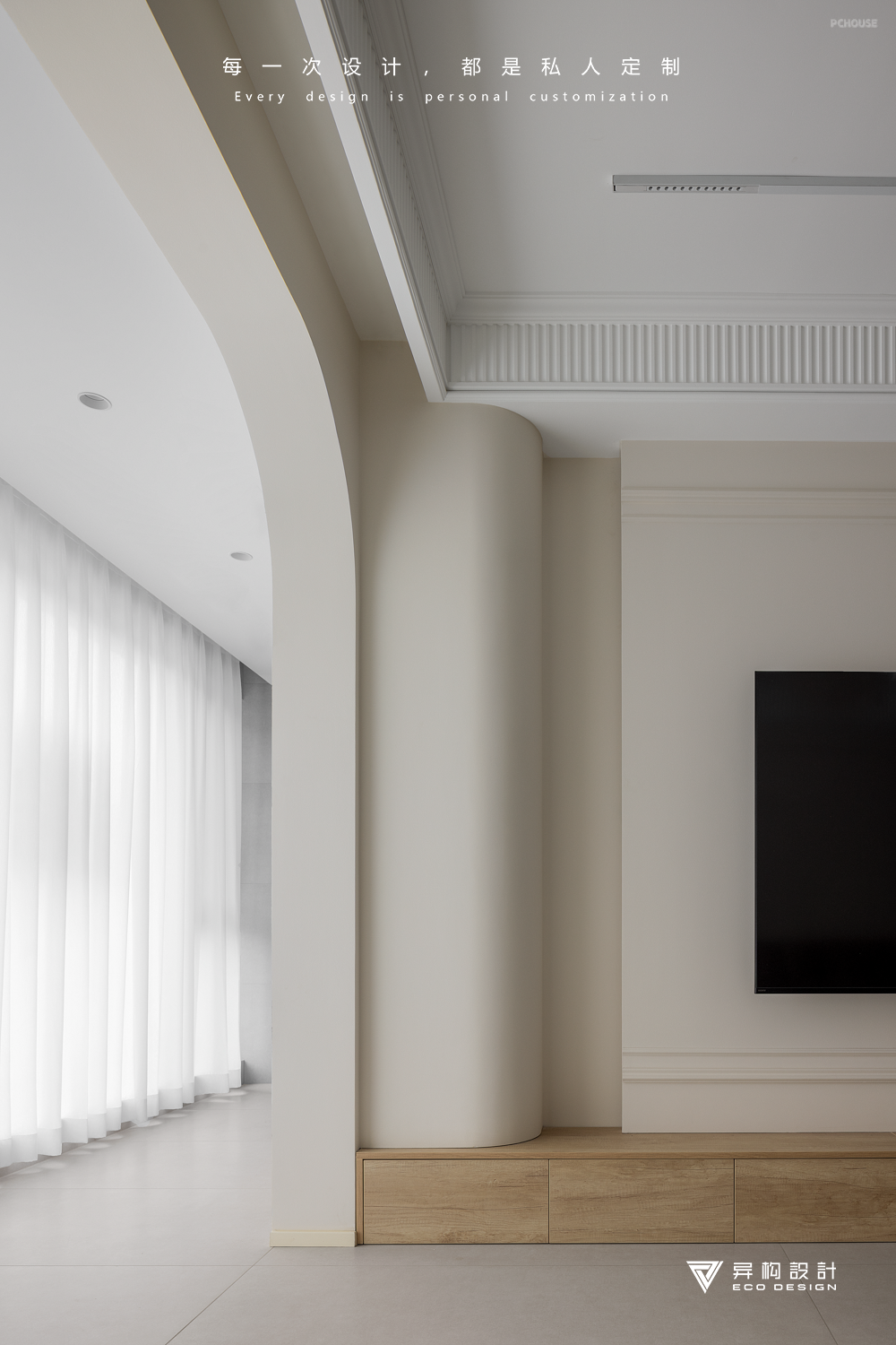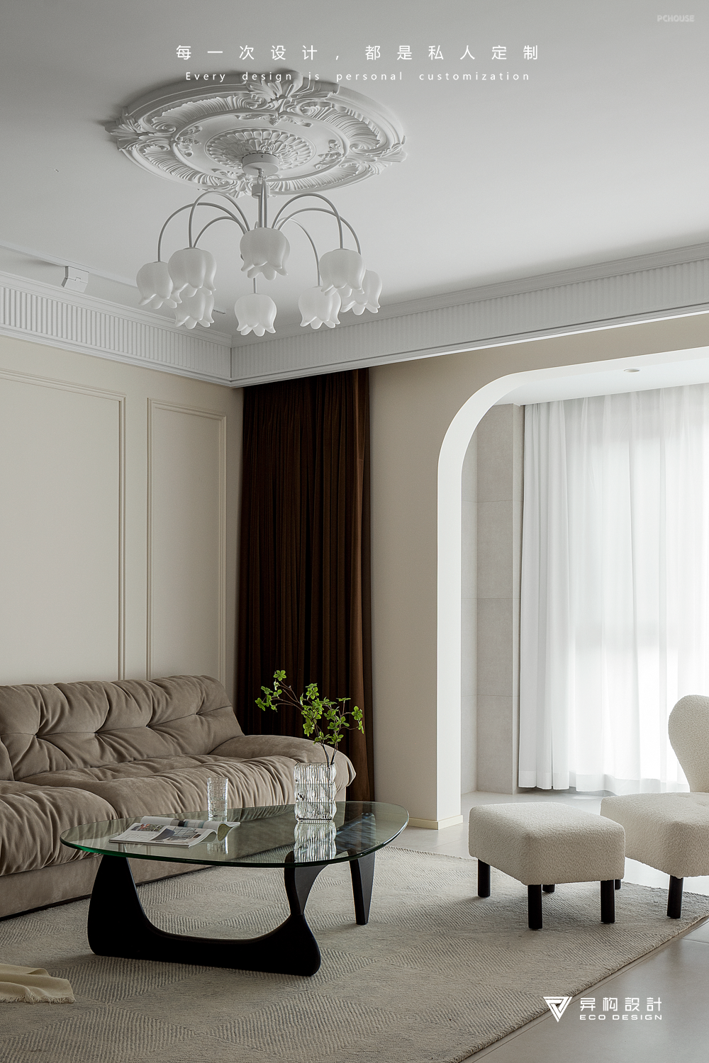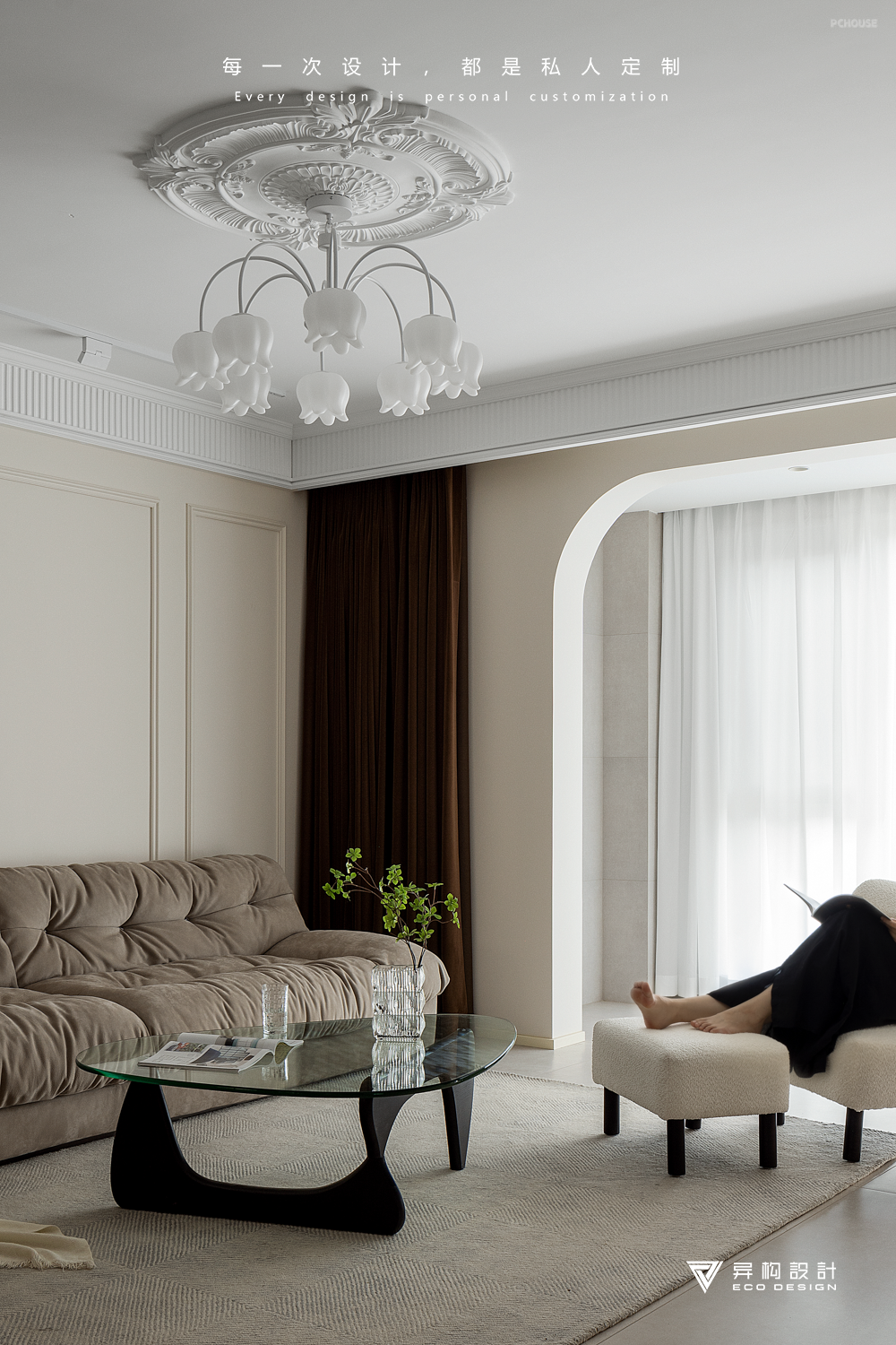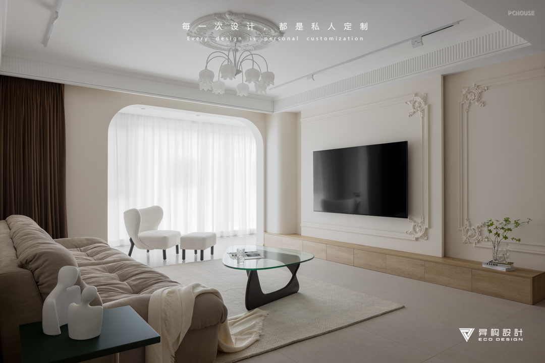 设计中主要改造部分是厨房旁边的生活阳台,以及客卫比较小将台盆外移缓解空间拥挤,同时增加空间层次感,最后在硬装上采用弧形线条以及石膏线条来增强法式氛围感。