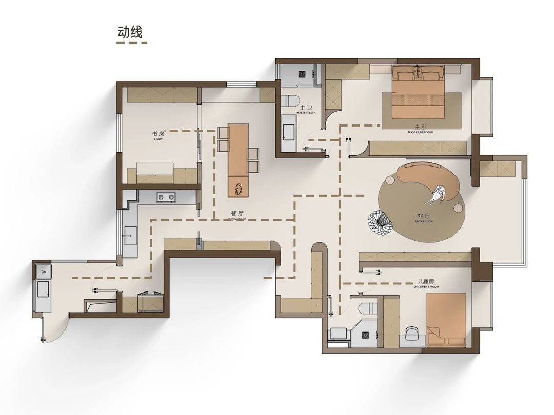 结合业主需求,在原有结构上进行改造,打造满足业主需求的合理动线,使空间相互呼应却又各自独立。将原本餐厅的位置改变,做客餐厅一体化设计,让空间更加通透,打造一个舒适明亮开阔的家居环境。