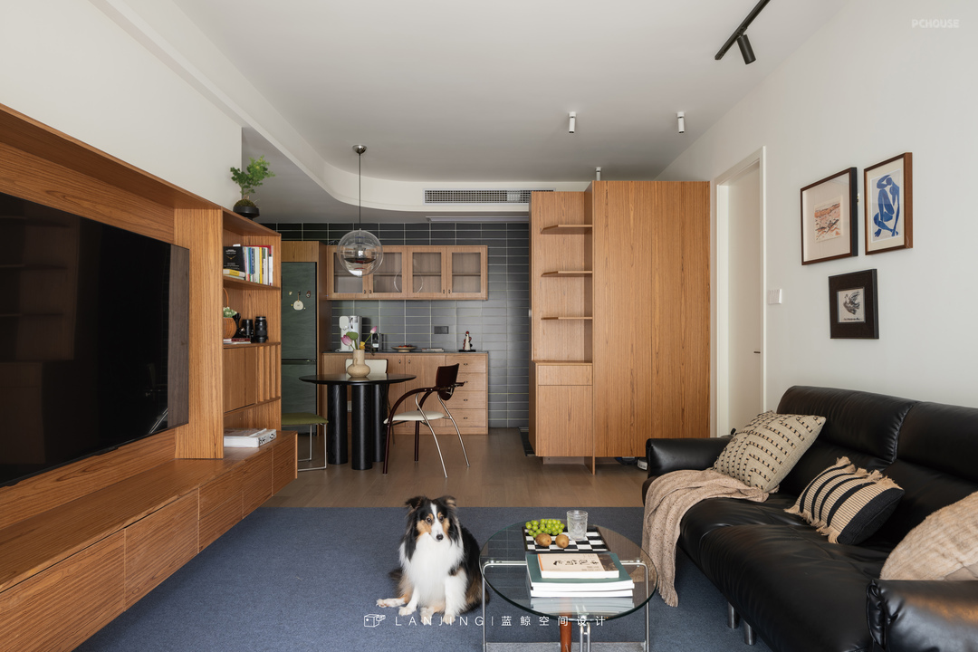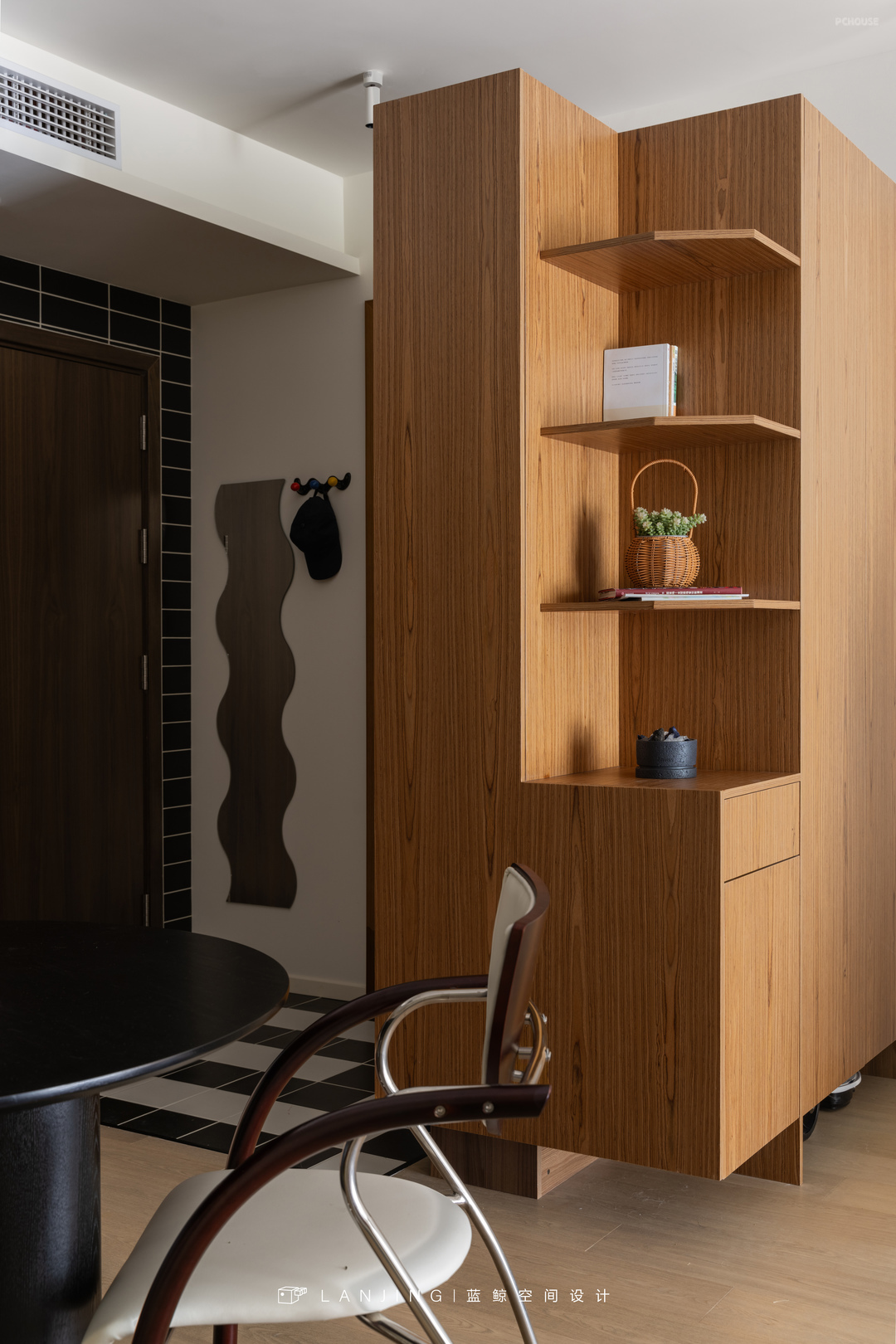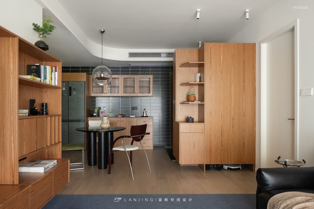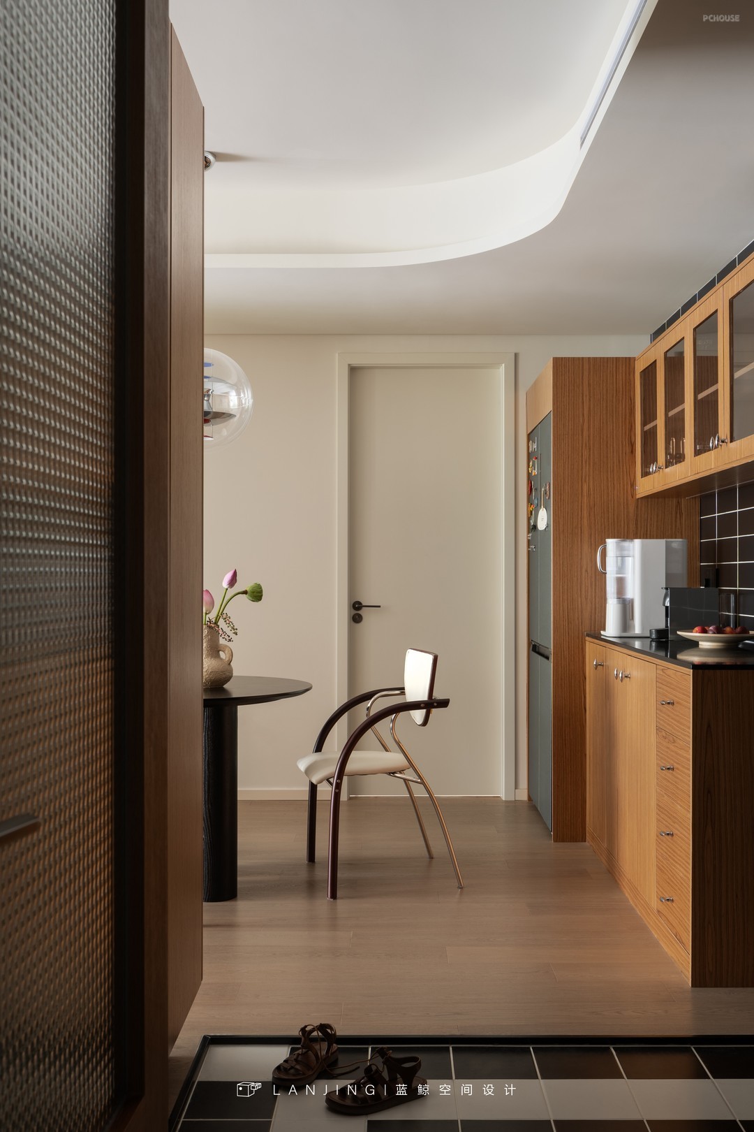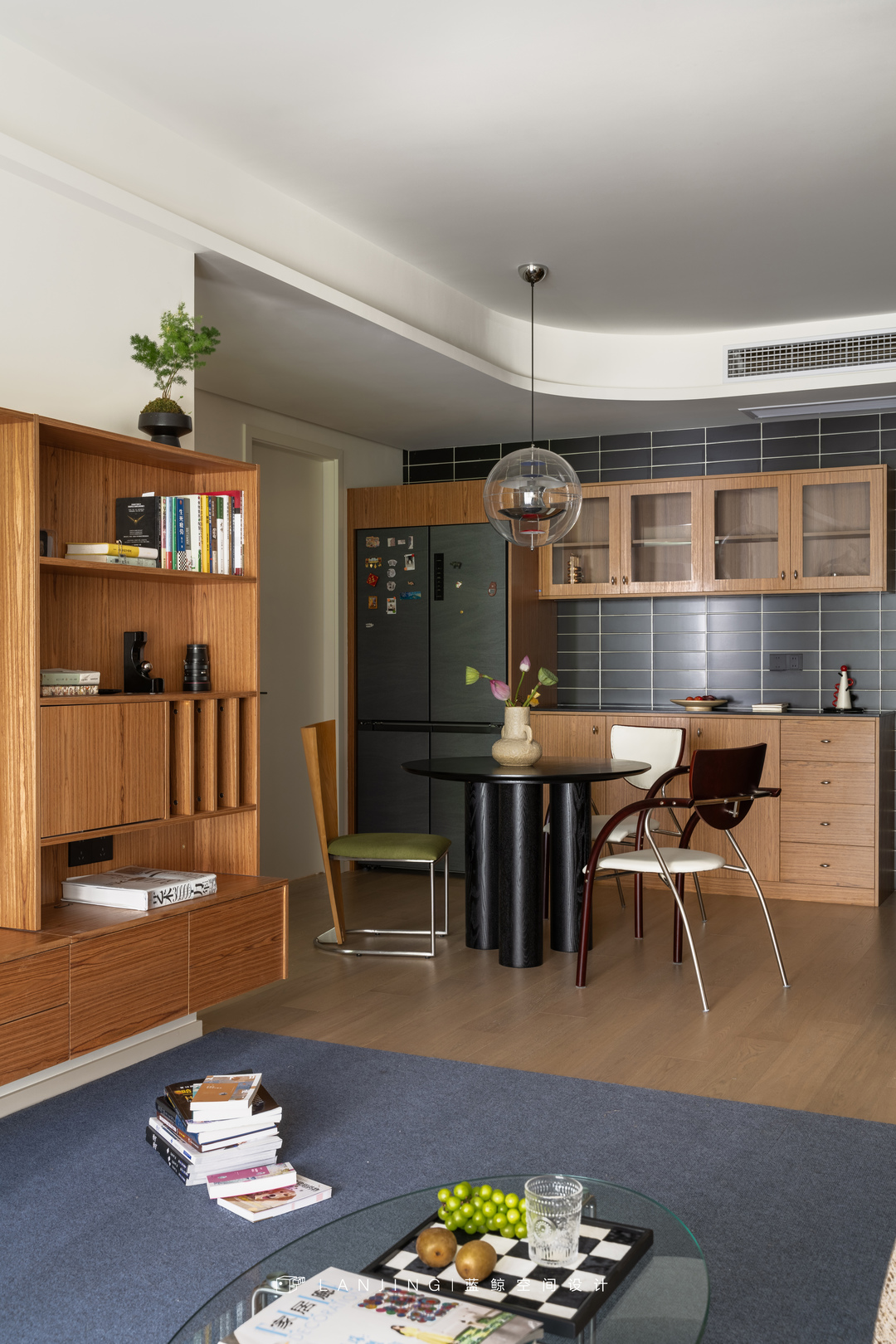 左侧包裹了冰箱,可以解放厨房的空间,冰箱靠近茶水台和客厅,可以最大限度的方便业主这样的饮料爱好者,柜子整个都不到顶,减轻体量感,胡桃木色配黑色墙砖,复古感拉满。