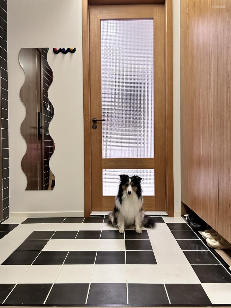 进门口区域借着地暖的高度差,做了下沉式的玄关,用黑白砖拼花,取代传统的地垫,方便狗狗进出门打理卫生,也方便收取快递和外卖的时候不把室内弄脏。