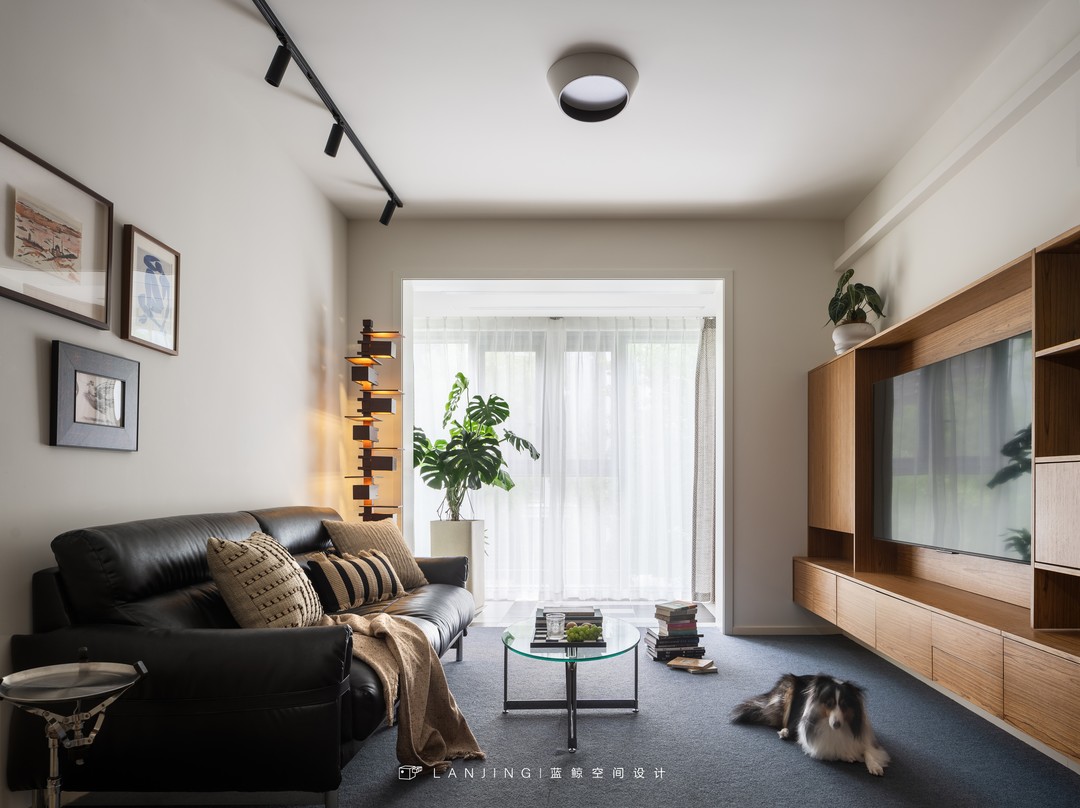 客厅则是满铺灰蓝色的地毯,更加静音,对宠物的关节也很友好,短毛也易于打理。搭配皮质沙发和不锈钢茶几,更加中古。落地灯是流水别墅落地灯,灯泡是隐藏式的,光线很柔和。