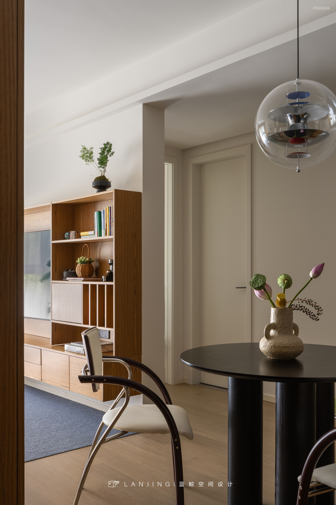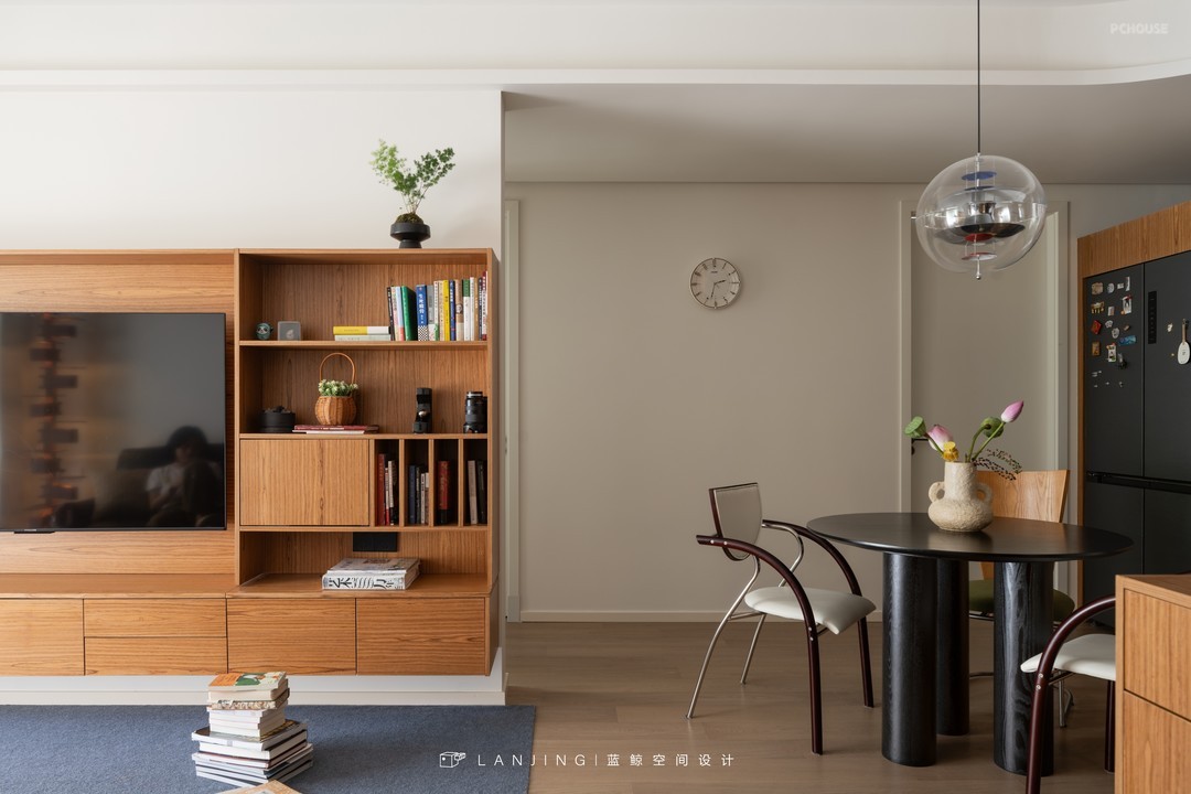 因为客厅的前后视距并不宽,业主又有放置盲盒和书籍的要求,所以做了整排的书柜兼电视柜,延续了上不顶天、下不落地的处理手法。因为正常书籍的窄边,比如A4纸是21cm,因此书架并不用很深,这里我们做了25cm的深度,而下半截我们设置了抽屉,抽屉太浅并不好用,因此抽屉做了35cm。整个柜子上浅下深,合理地利用了空间又避免了厚重感,增加储物的同时又不至于把空间压缩得太逼仄。