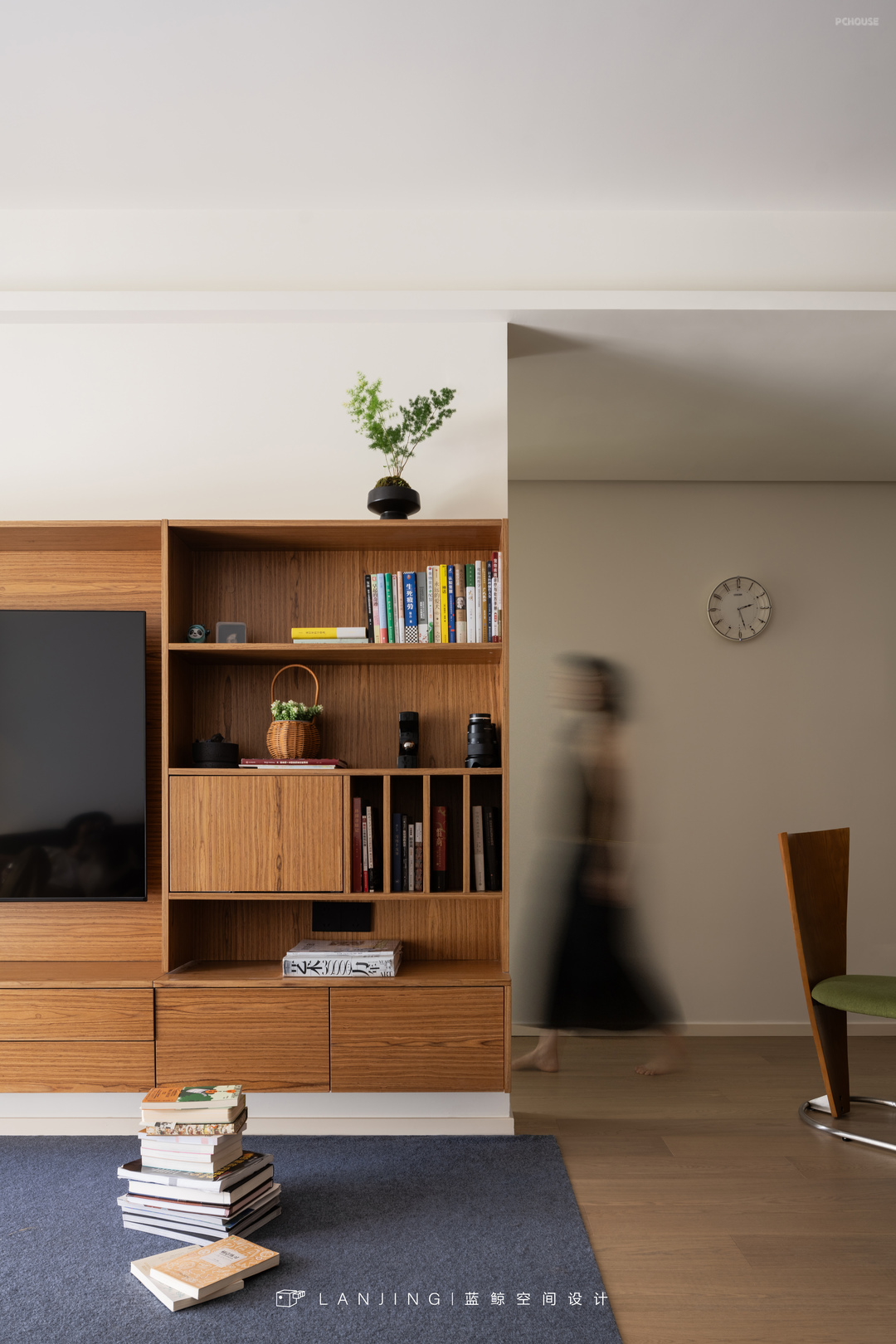 电视柜在客厅,需要一部分展示功能,又需要有一部分的收纳,因此采用了部分封闭部分开放的形式,在前期沟通需求的时候,业主就提出有放杂志的需求,因此还采用了中古竖形开放格的形式,既增加细节,又方便放置杂志。