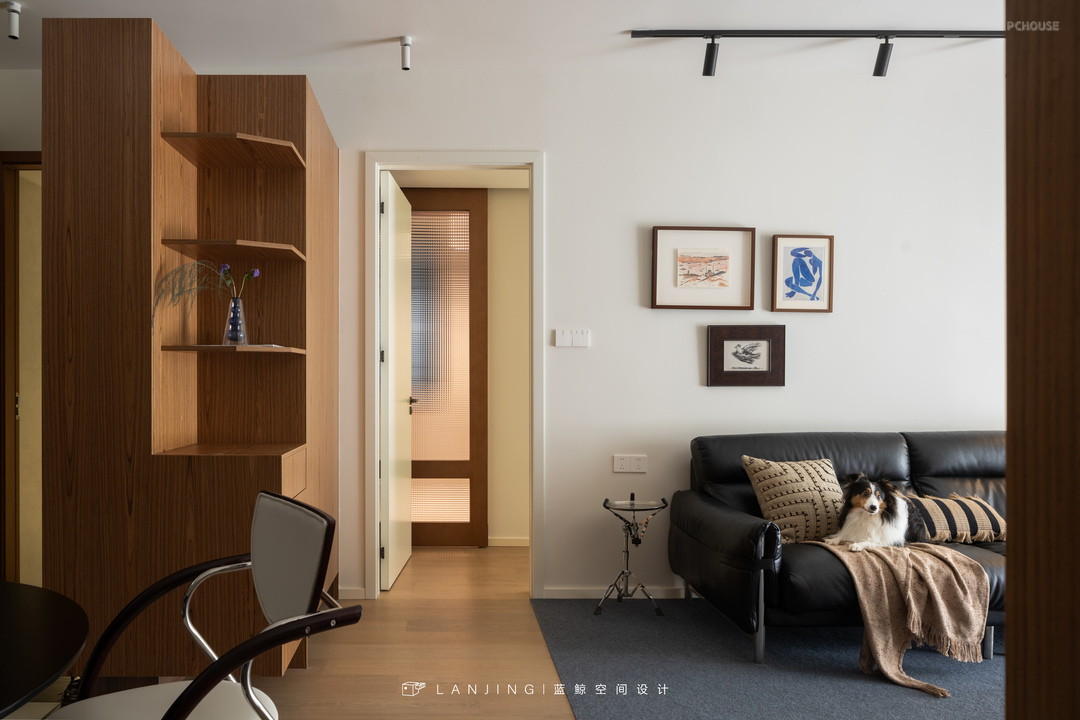 4、保留了电视墙的长度,刚好可以遮挡次卫生间的门口,既保护了隐私,又是一个给狗狗洗完澡之后吹毛和缓冲的区域,这是在家访过程中,业主提出的需求。
