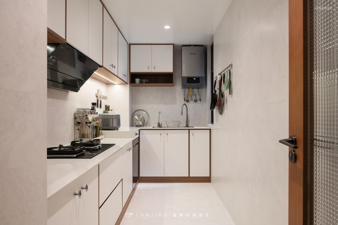 厨房为了最大限度的保留光线,采用了浅色的砖,配浅色橱柜的做法。为了呼应房屋主体的中古风格,采用了边框分色的形式,柜门用白色,边框和踢脚则采用了胡桃木的颜色。台面为了减少体量感,没有做下挂加厚台面,也减去了挡水条,尽量减少不必要的细节,把一切归于实处,贴合包豪斯风格强调的极简主义和功能性。