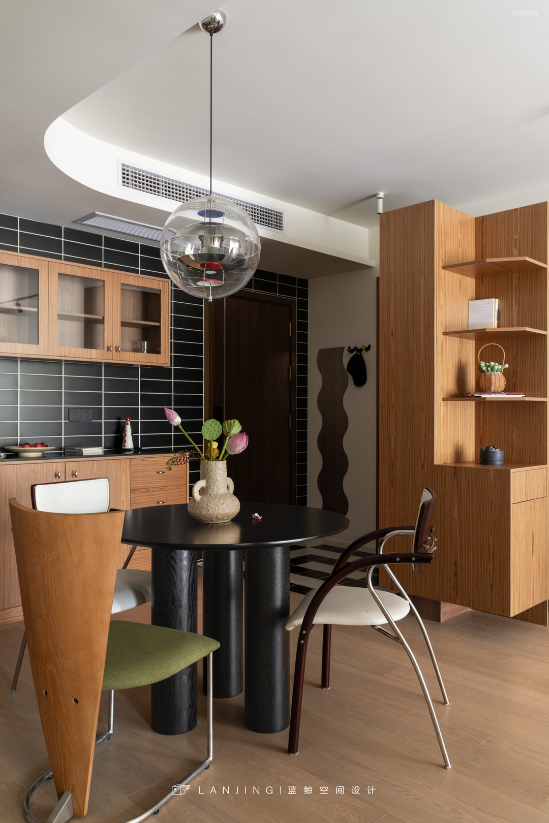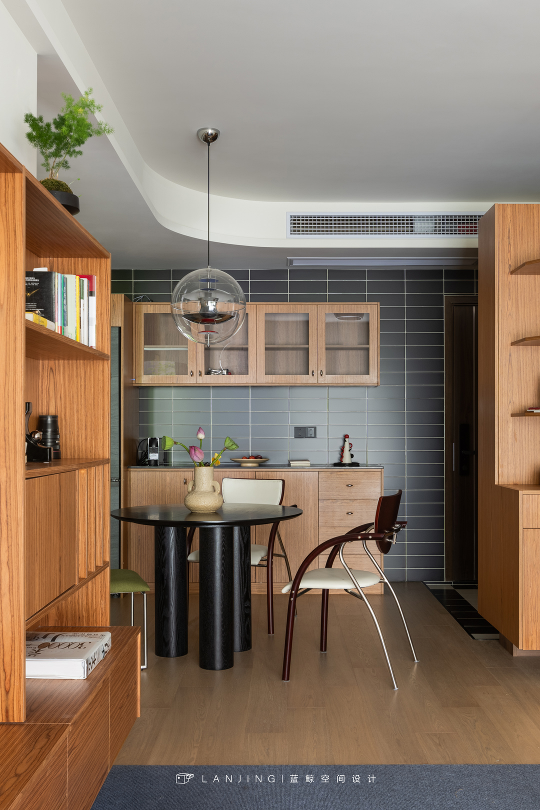 门厅过来就是餐厅,进门的右边做了一排茶水台,满足业主自制咖啡的需求,可以当作餐边柜来使用,也方便进门随手放置物品。背后横贴黑色的长条砖,复古又有秩序感,是包豪斯的经典元素之一。茶水台分为地柜和吊柜,吊柜做了玻璃柜门,更加通透,下方隐藏灯带,方便操作。