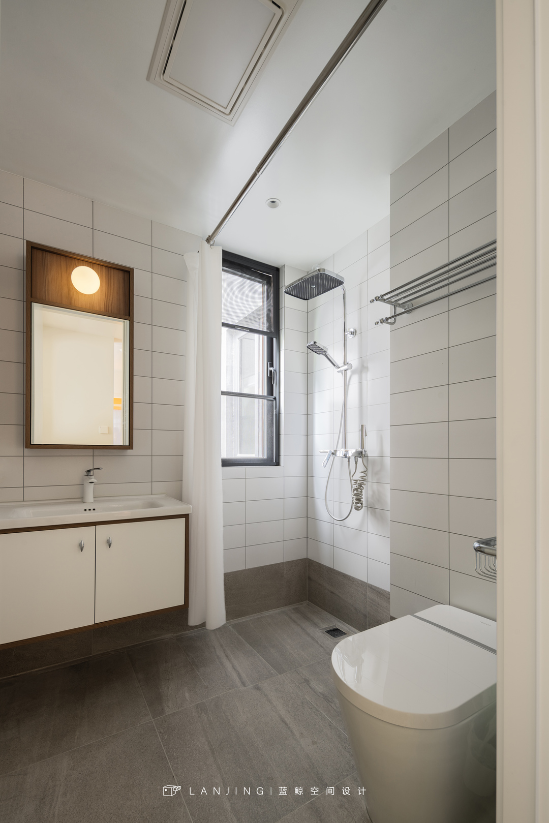 浴帘是宜家的路德哈通系列,不挂水,位置定在淋浴下沉区域内,溅上的水可以直接流入淋浴区地漏,减少卫生任务。