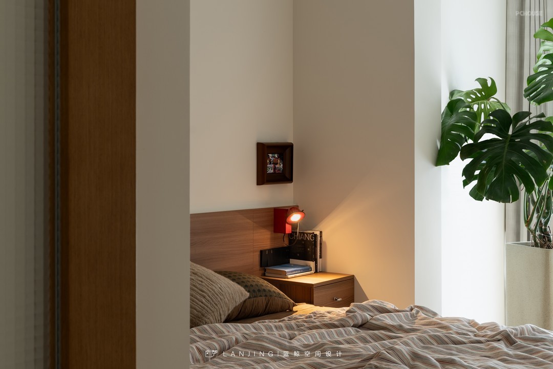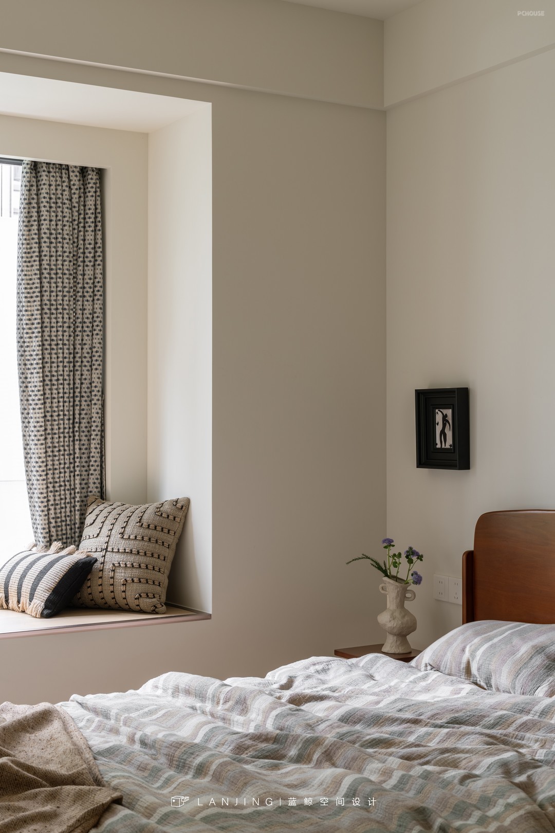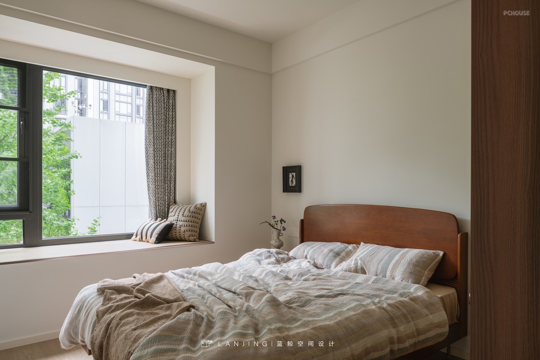 次卧则用了樱桃木的床架,搭配水洗棉的条纹床品,慵懒自由。