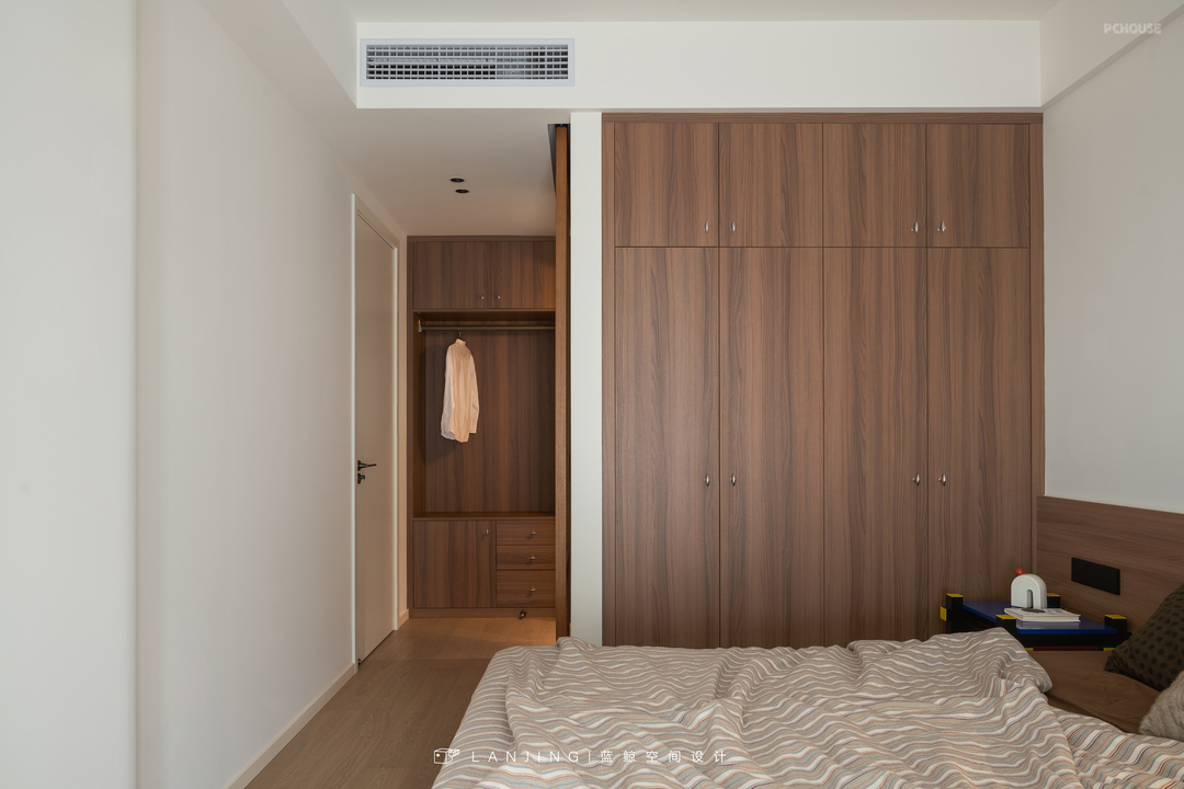 进入主卧后,门后方是次净衣柜,用来收纳穿过但不需要清洗的衣物,或者家居服,因为在主卫生间门口,上下带柜门的柜体可以用来收纳主卫生间的日常用品。