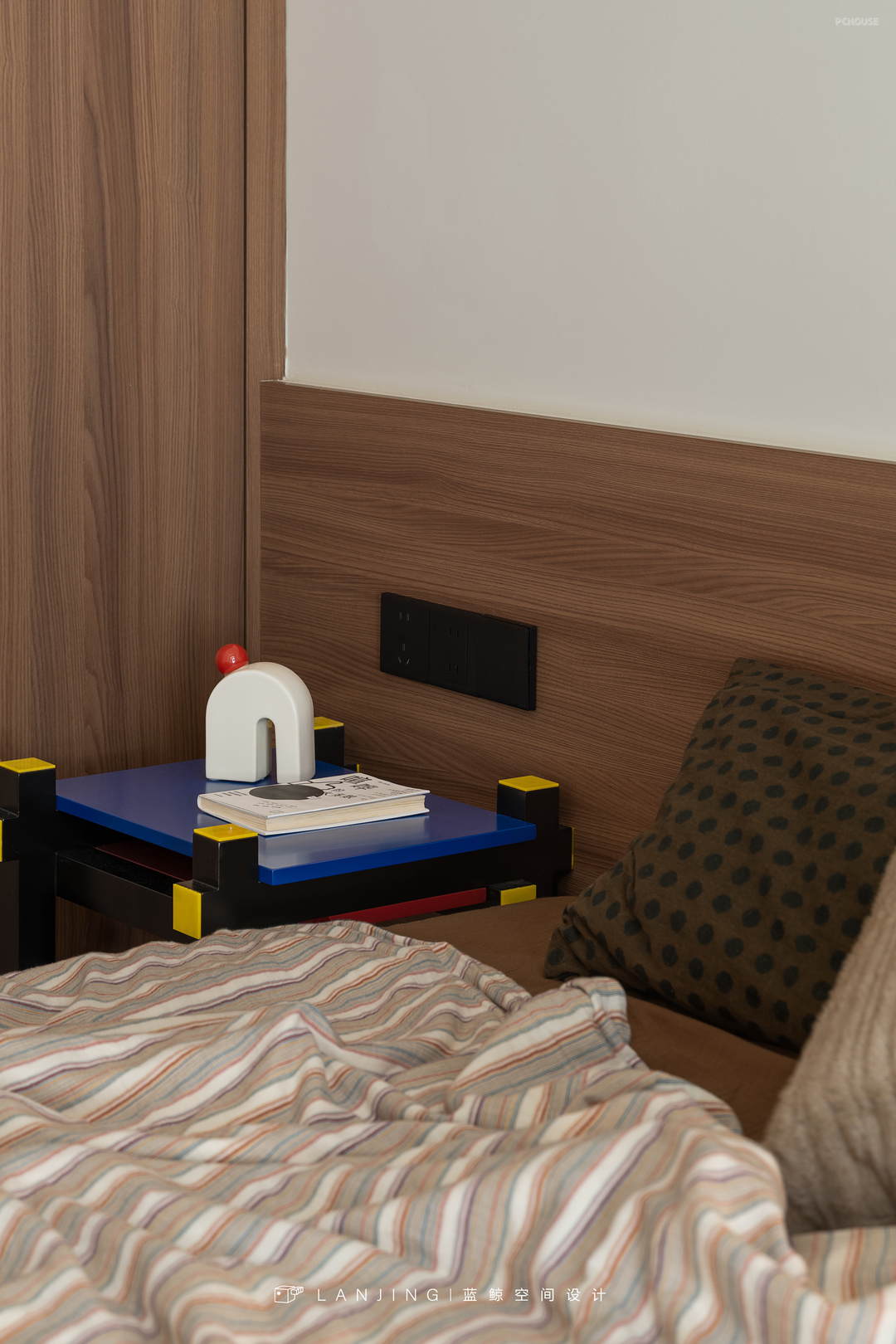 床头墙板和衣柜延用了胡桃木色,床头一侧配了蒙德里安配色的床头柜,另一侧搭配了《巴塞尔和莱茵河的风景》挂画,和minibox的大红色壁灯,壁灯可以随意调整角度,把中古元素融入到各个细节和单品里。