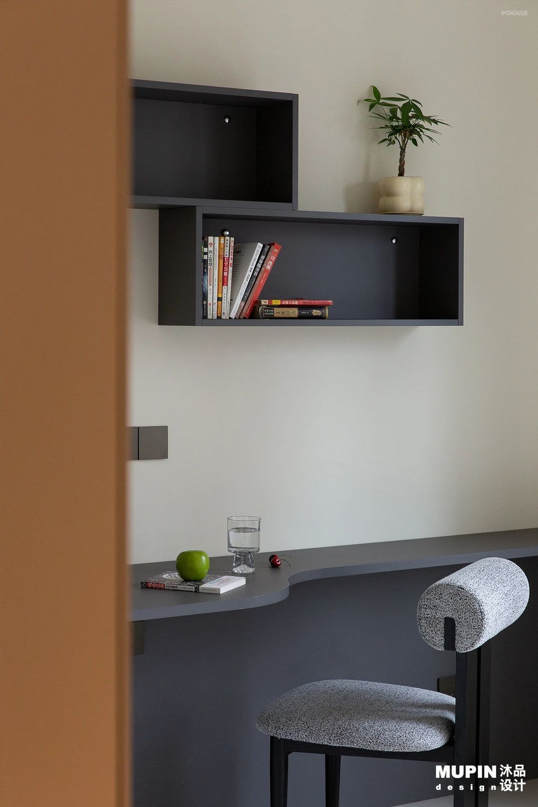 桌子上方镂空书架如同灵动的艺术装置,