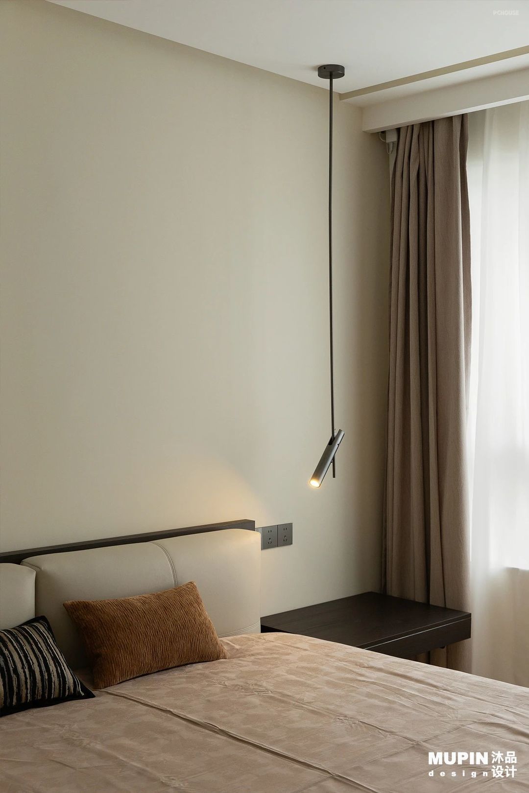 在床头设置简约的吊灯作为辅助照明。