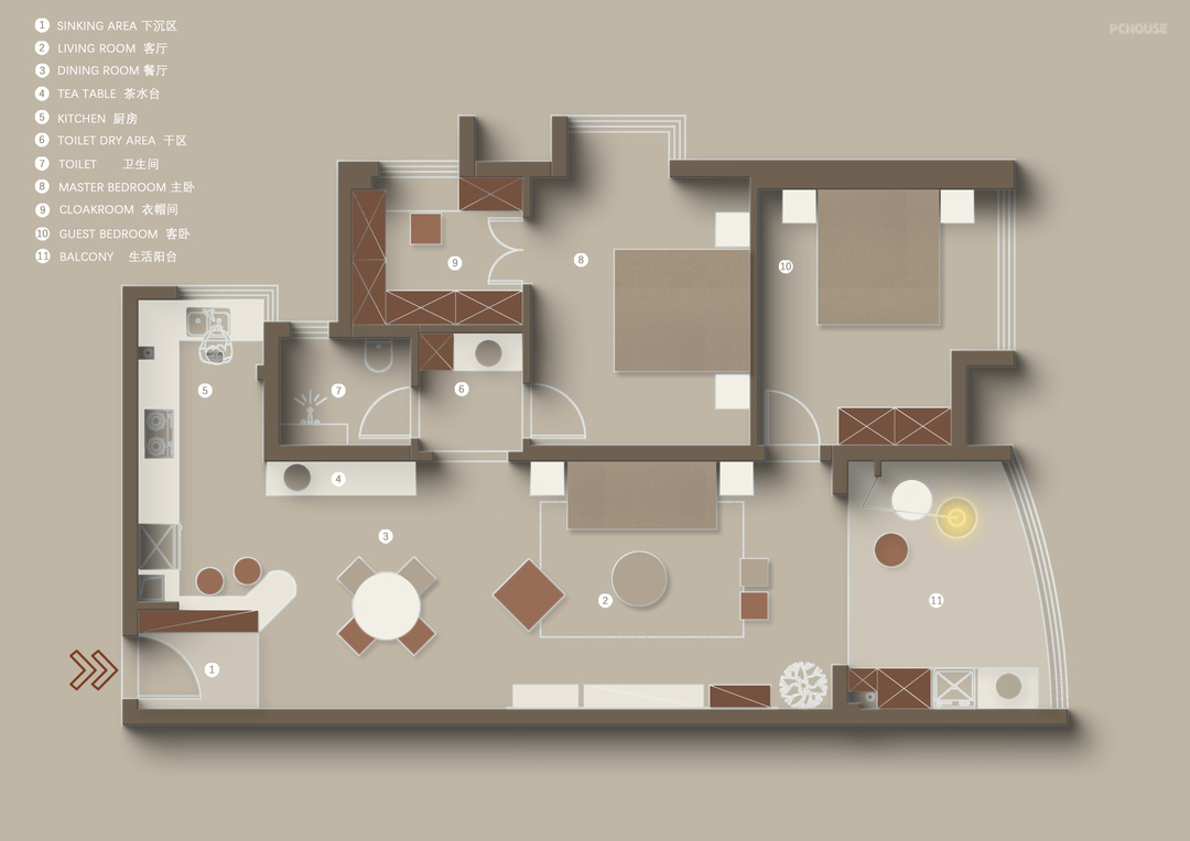 1、原本空间10是主卧,改造后空间10变成次卧,从客厅方向进。