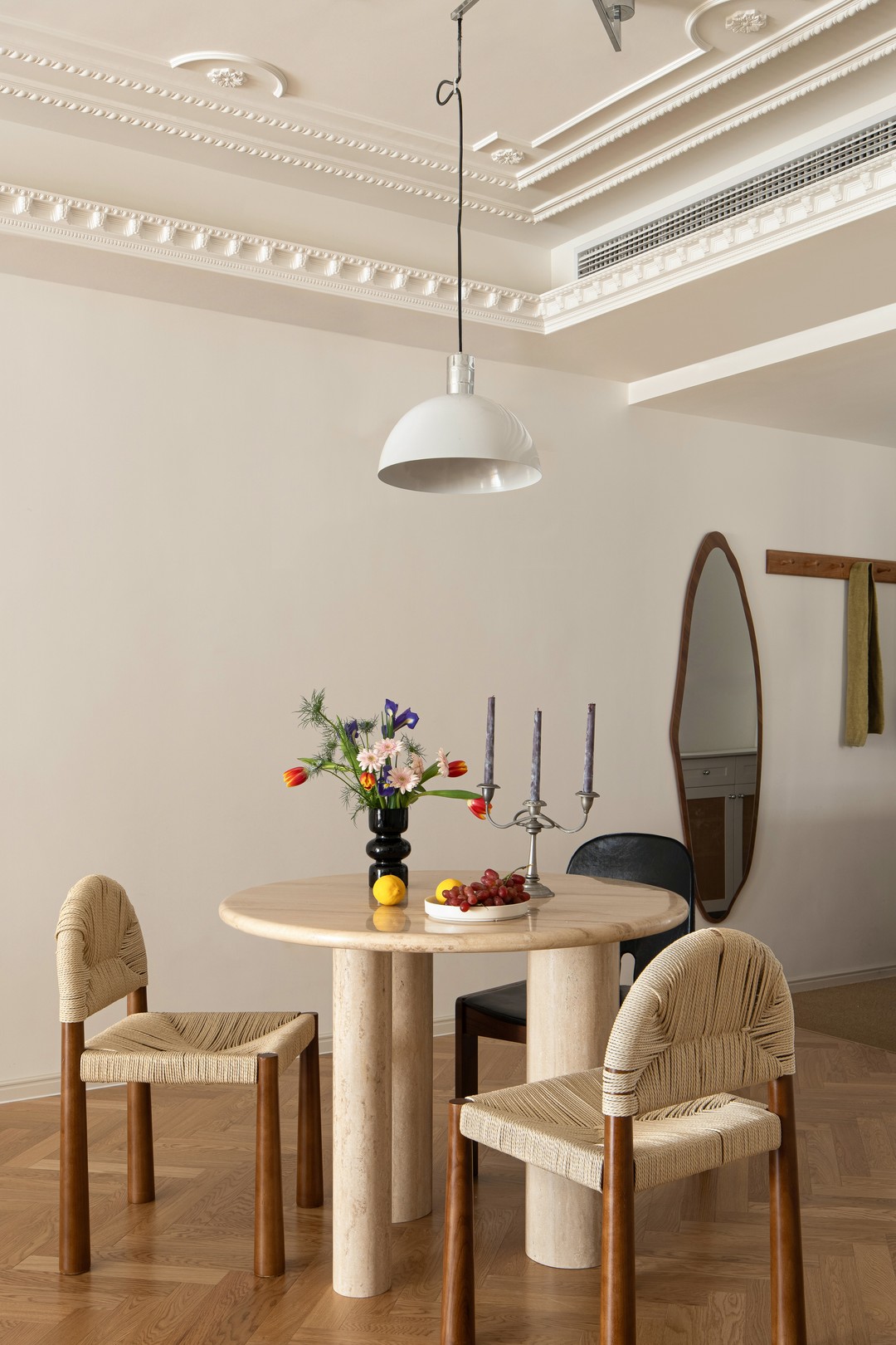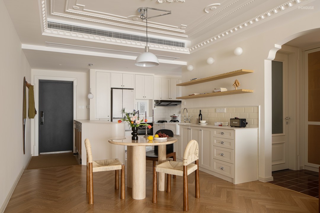 餐厅选择了洞石的圆餐桌,柔化了空间,并且能容纳更多的客人,洞石的材质很厚重,能增加餐厅的体量感,色调也非常统一。如果担心石材不好打理,可以在餐桌表面刷石材封闭漆。