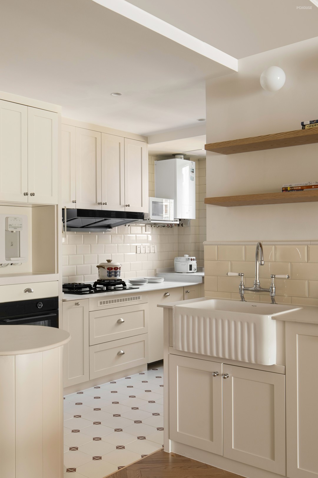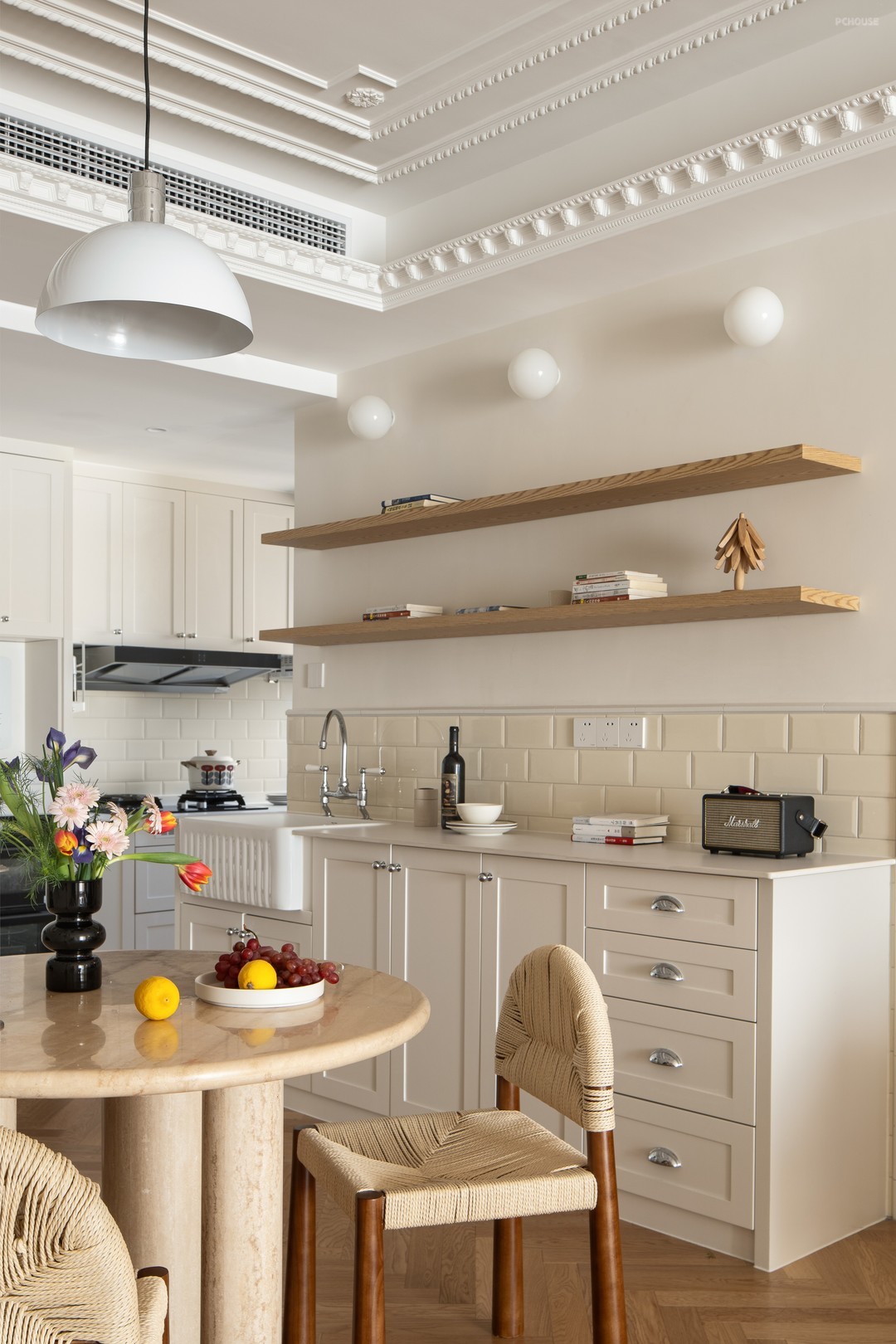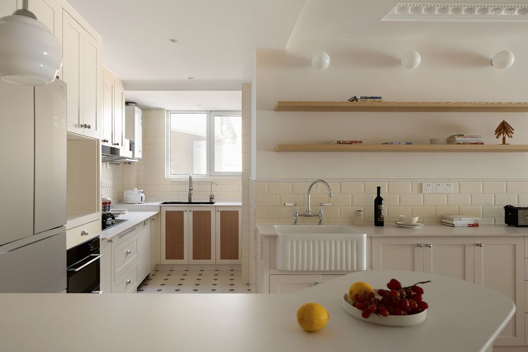 取消了之前的厨房门,在原本餐厅的墙面做了一排茶水台,加设了陶瓷盆,延续了奶油色的面包砖,墙面加了层板可以放一些杯子,搭配半墙砖和龙珠壁灯,复古又文艺。