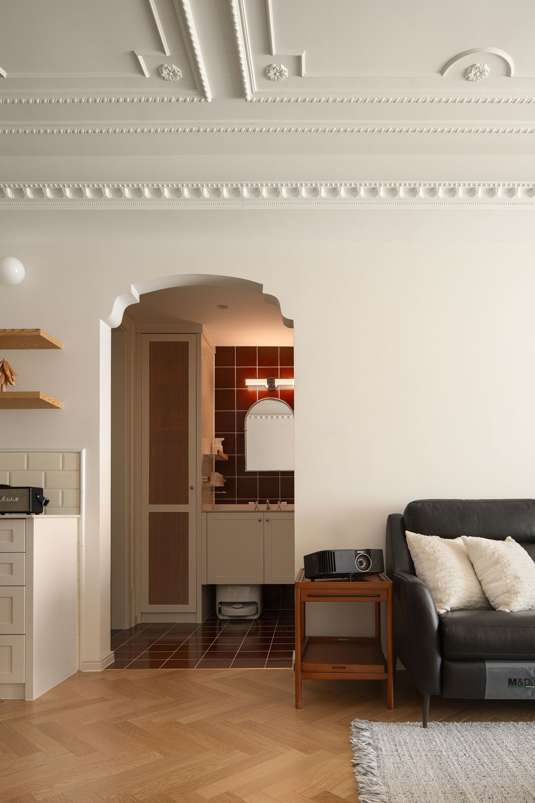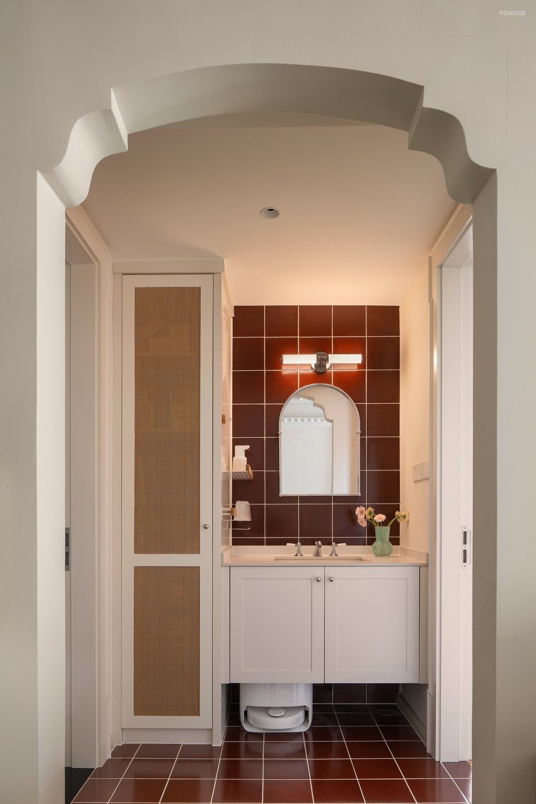 客餐厅之间是进卫生间和主卧的门洞,门洞做了造型,和酒红色的瓷砖搭配起来,复古韵味十足