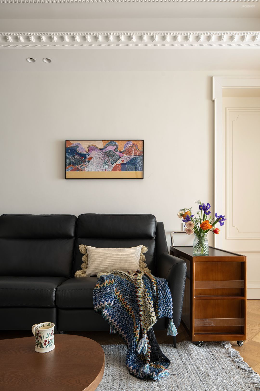 黑色的功能沙发可以变换半躺模式,观影的时候非常治愈……异形的茶几化解了电动沙发的古板,边几是放满零食的推车,在家就能体验私人影院,松弛感拉满。