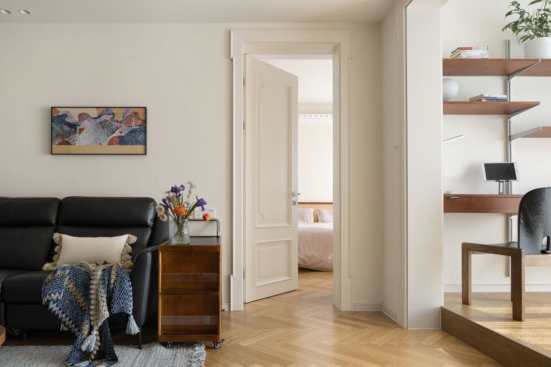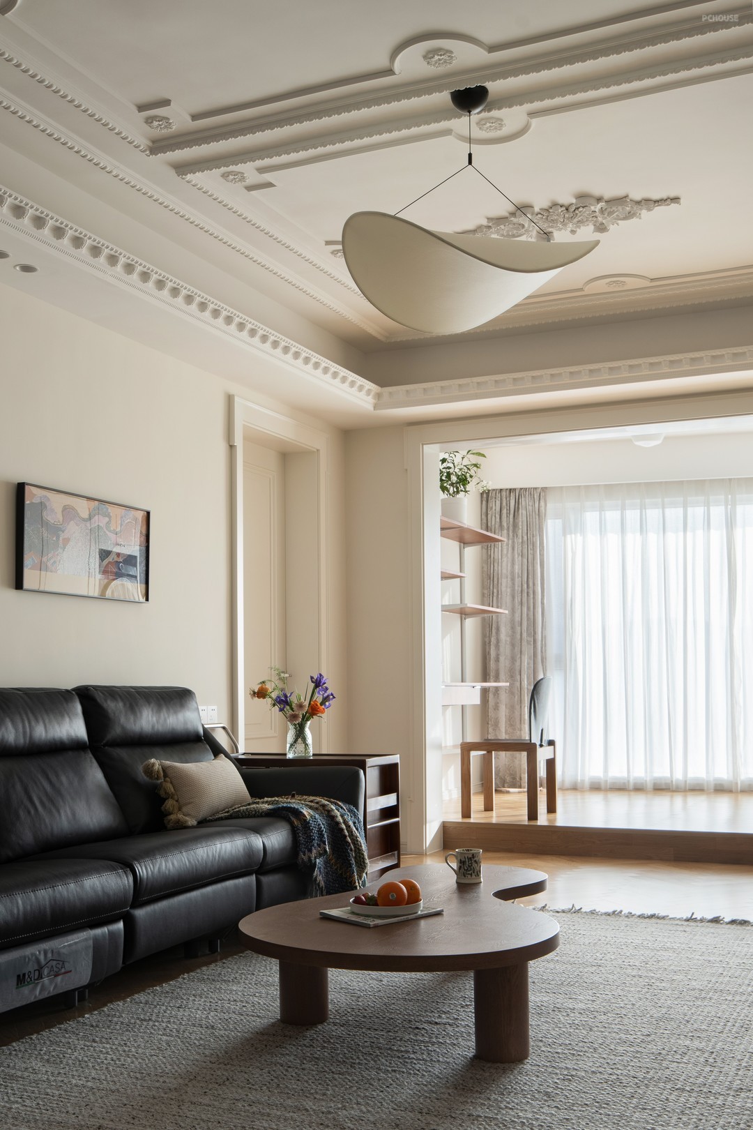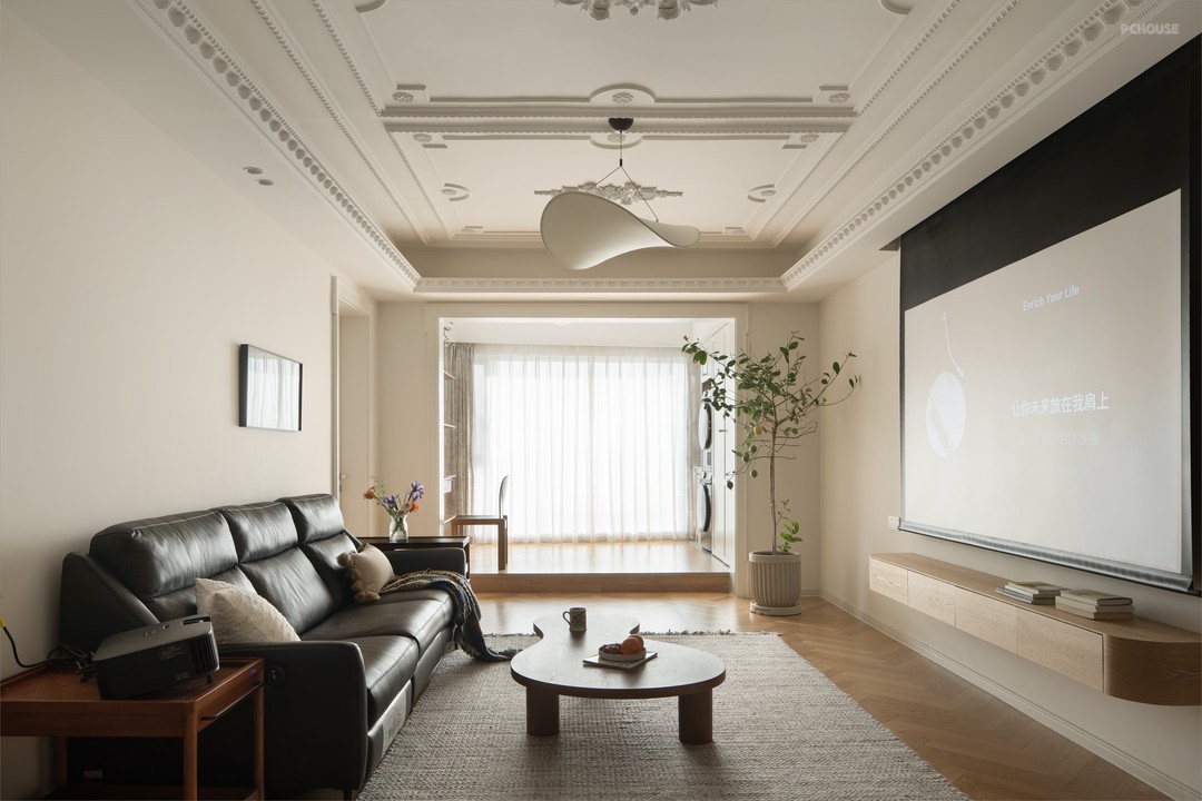 法式注重仪式感,所以在天花上做了线条,把整个吊顶细分成三块,避免了吊顶显得过于细长的感觉,整个空间铺了人字纹的橡木地板,更加温馨。客厅采用了投影来代替传统的电视,电视柜也采用了悬空的方式减轻体量感。