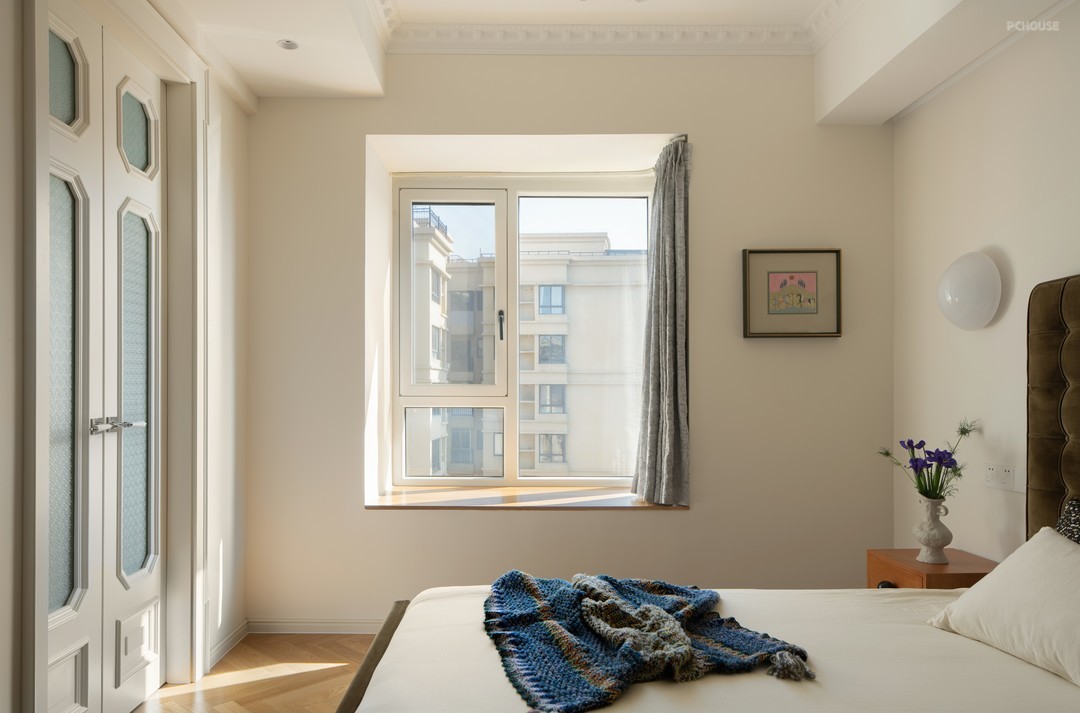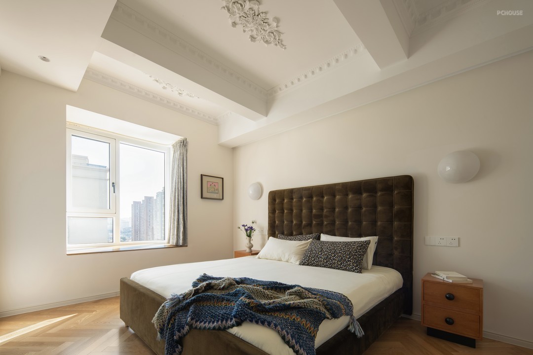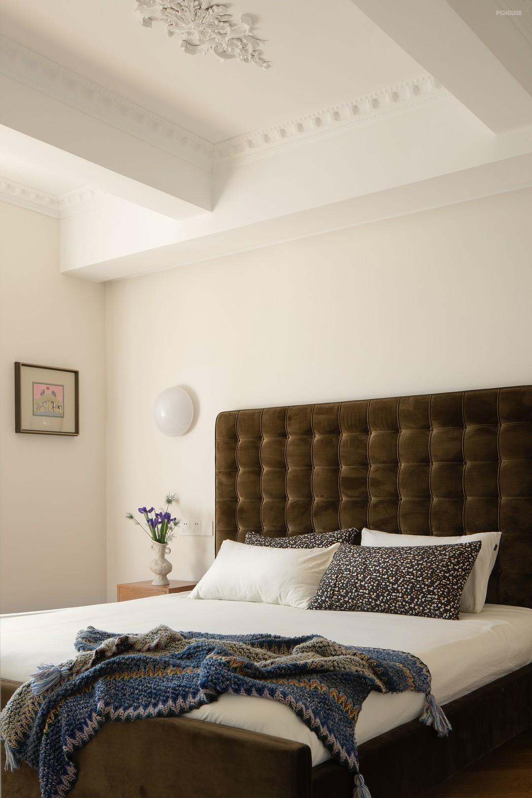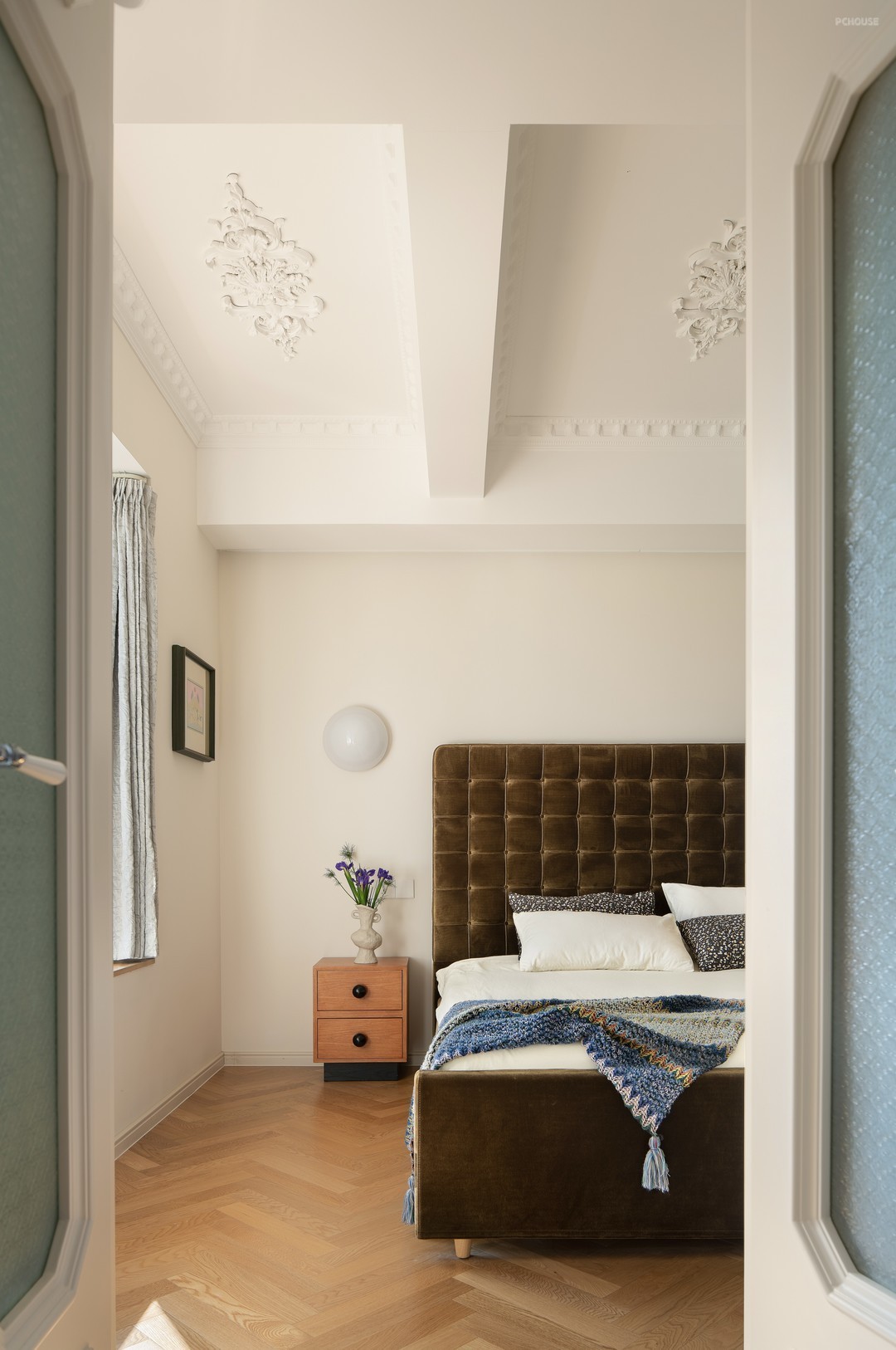 干区右边是主卧。主卧室是由原来的小次卧,加上过道的区域合并而成的,因户型的改造,房顶的一道梁体显现出来,所以对称着做了一道假梁,并增添了石膏线和石膏角花,用整个造型来弱化原始梁体的存在。整个房间也刷上了奶油色系,搭配墨绿色丝绒高背床,复古温馨。