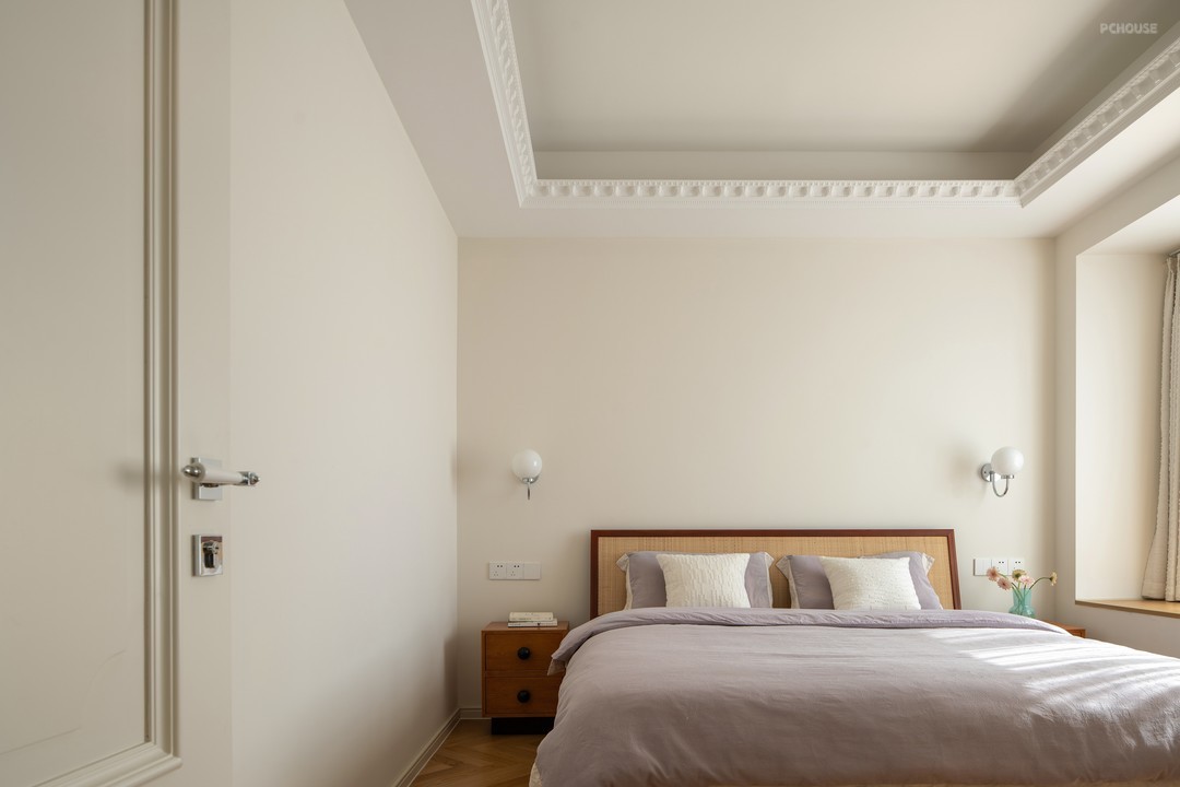 次卧选择了藤席靠背的床,与柜门的材质相呼应,搭配紫色的床品,温柔又复古。