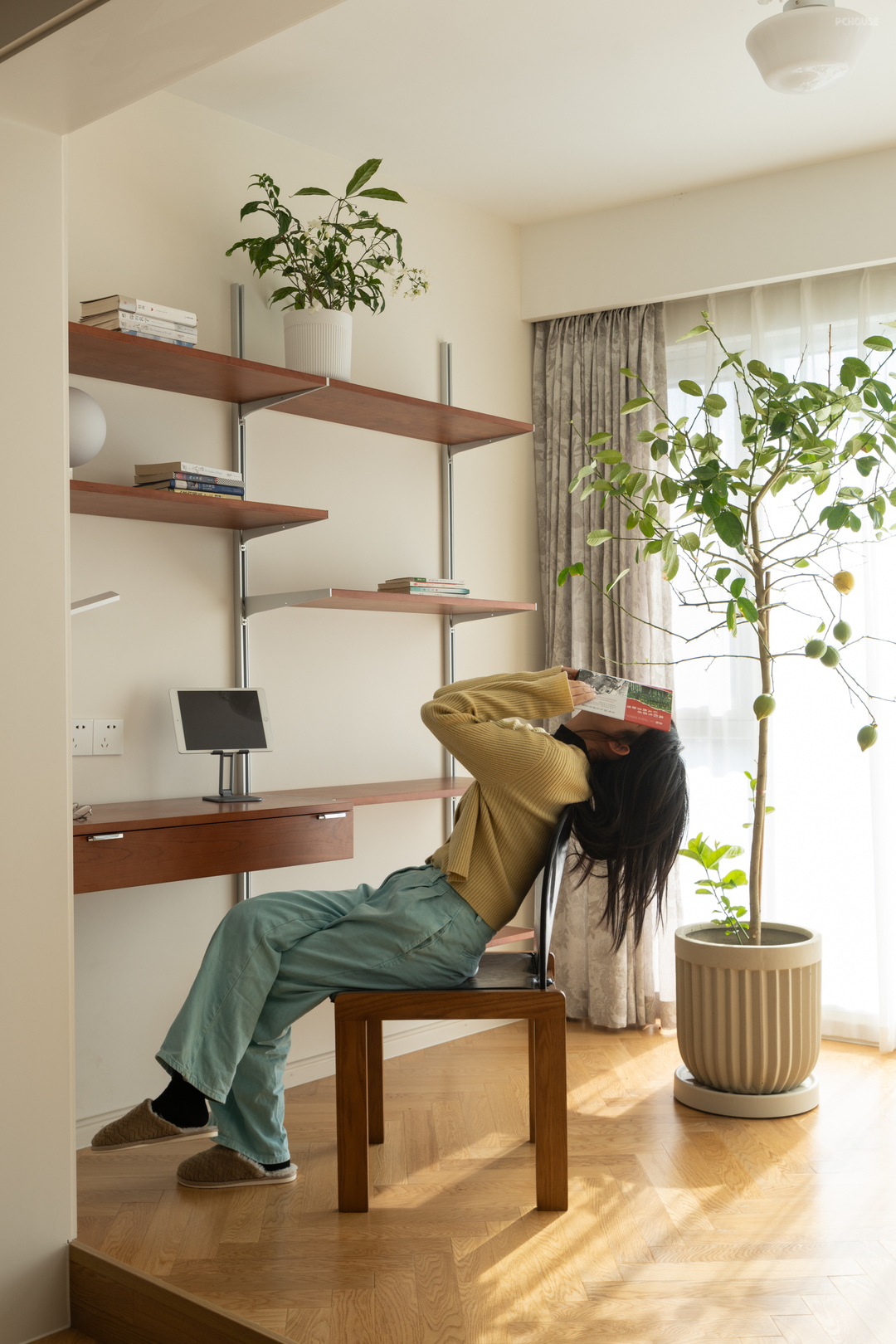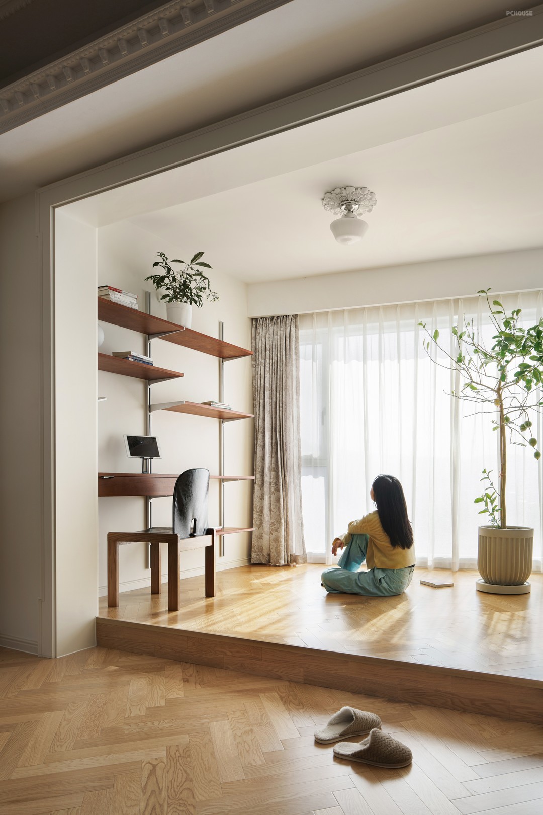 低饱和度得奶油色,圆润得软装造型降低了边界感。