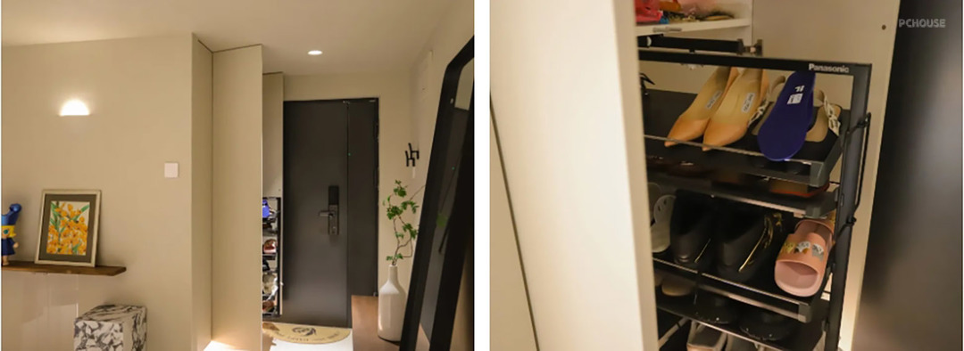 进门右手边是一组1200*550mm的鞋帽柜,其中最左侧单独一组挂衣区,右边一组对开门,下面是高度1米的旋转鞋架,它适合这种较深的柜体,两面都可以放鞋,上面是层板放包包、口罩之类的。柜子下面做了150mm的悬空,方便换常穿的鞋,里面有灯带,和顶面射灯一样都是人体感应控制的,人在即亮,人走即灭。