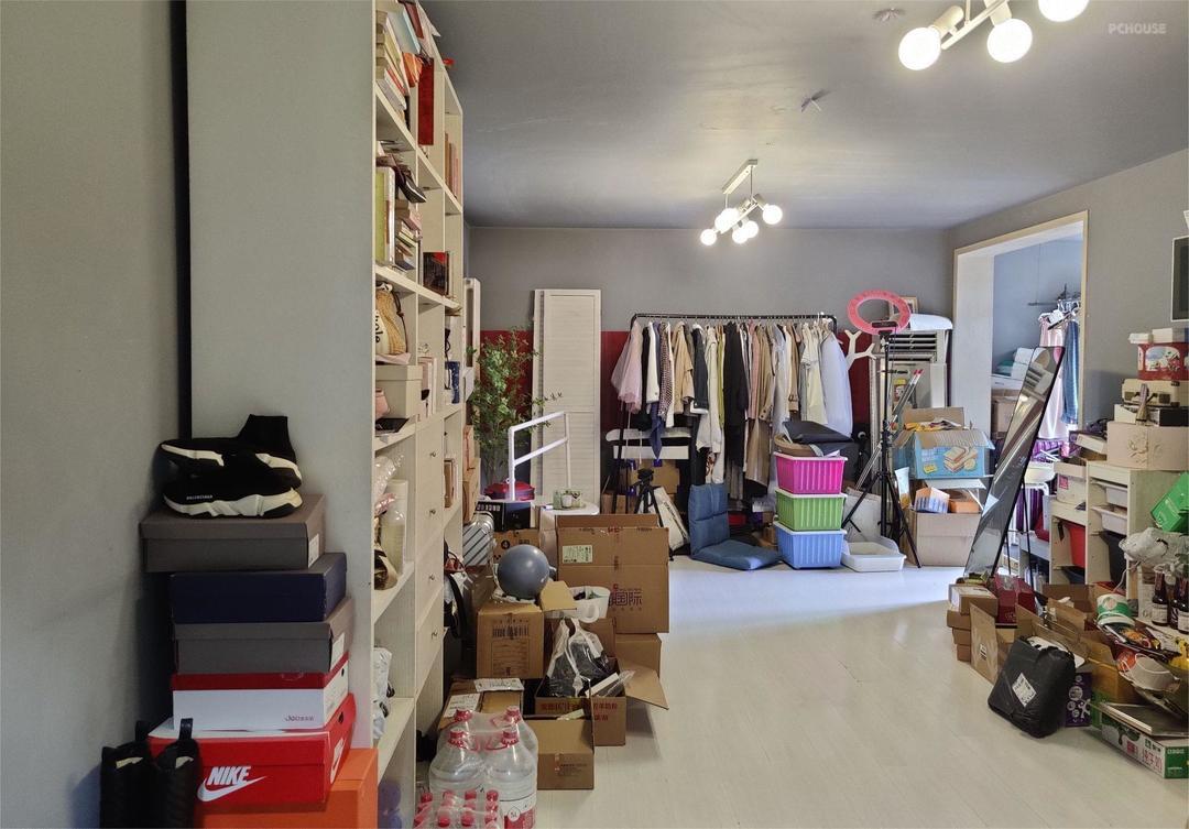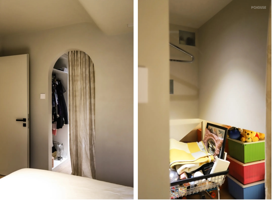 原来的次卧除去儿童房的空间,剩下的就都是衣帽间的区域,包括左边一组长1.5米的高柜,还有儿童房床下和楼梯下的所有空间,床下的空间主要通过带轮的收纳箱来收纳,也是能装下不少东西的。