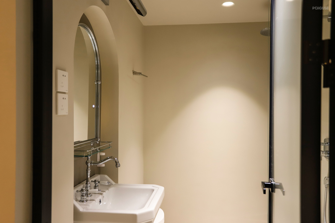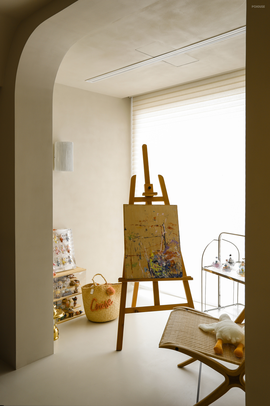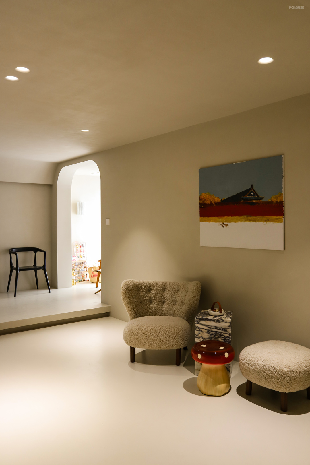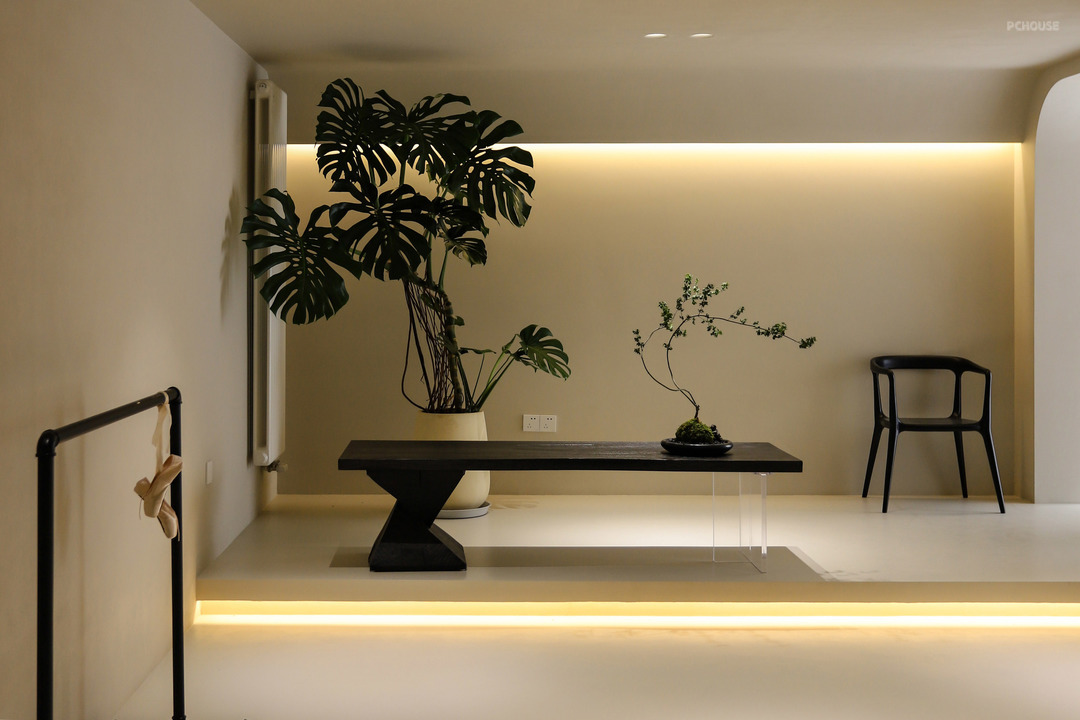 茶室的地台延伸到阳台,垭口和吊顶呼应做了弧形处理,这种弧线的过渡,在家里的很多地方都能看见,包括之前提到的石膏灯,后面在主卧、卫生间、衣帽间、儿童房都有这样的元素,它就像微水泥与生俱来的一种属性,象征着自然、有机、生命力。