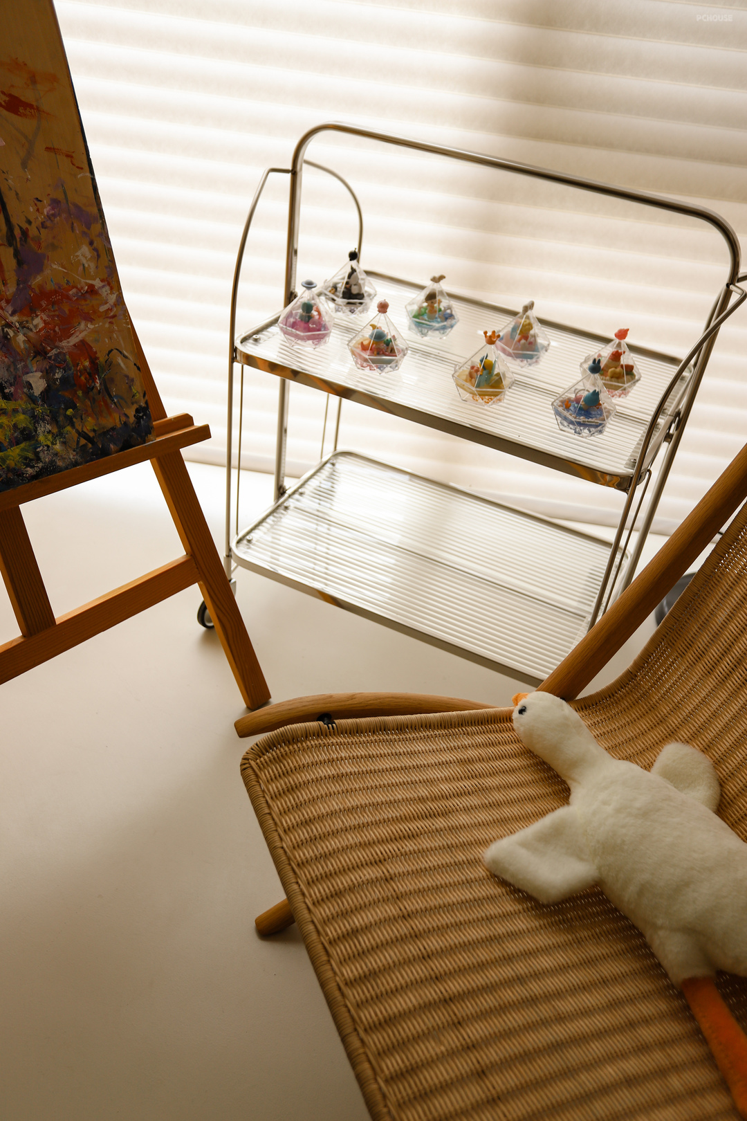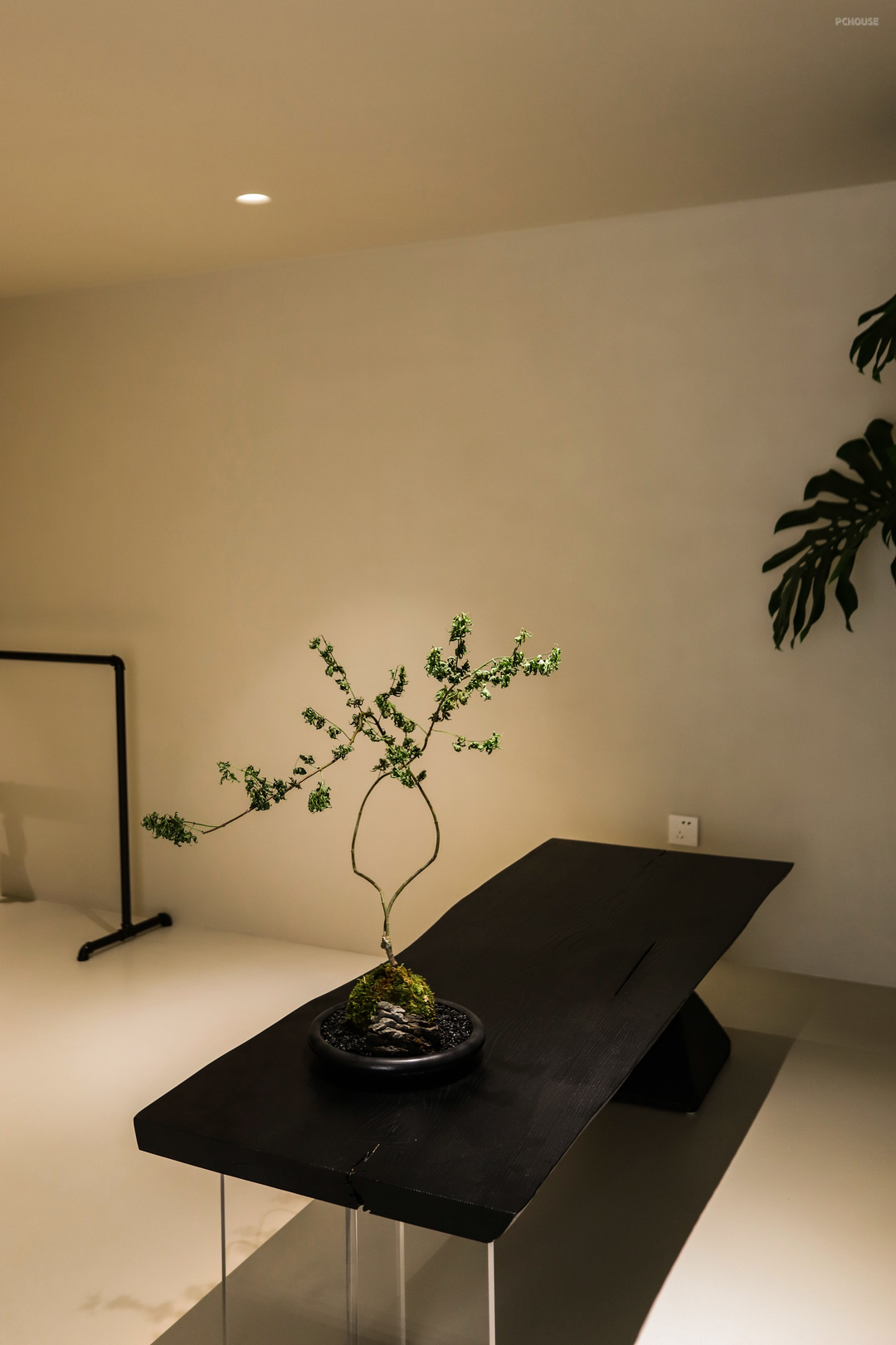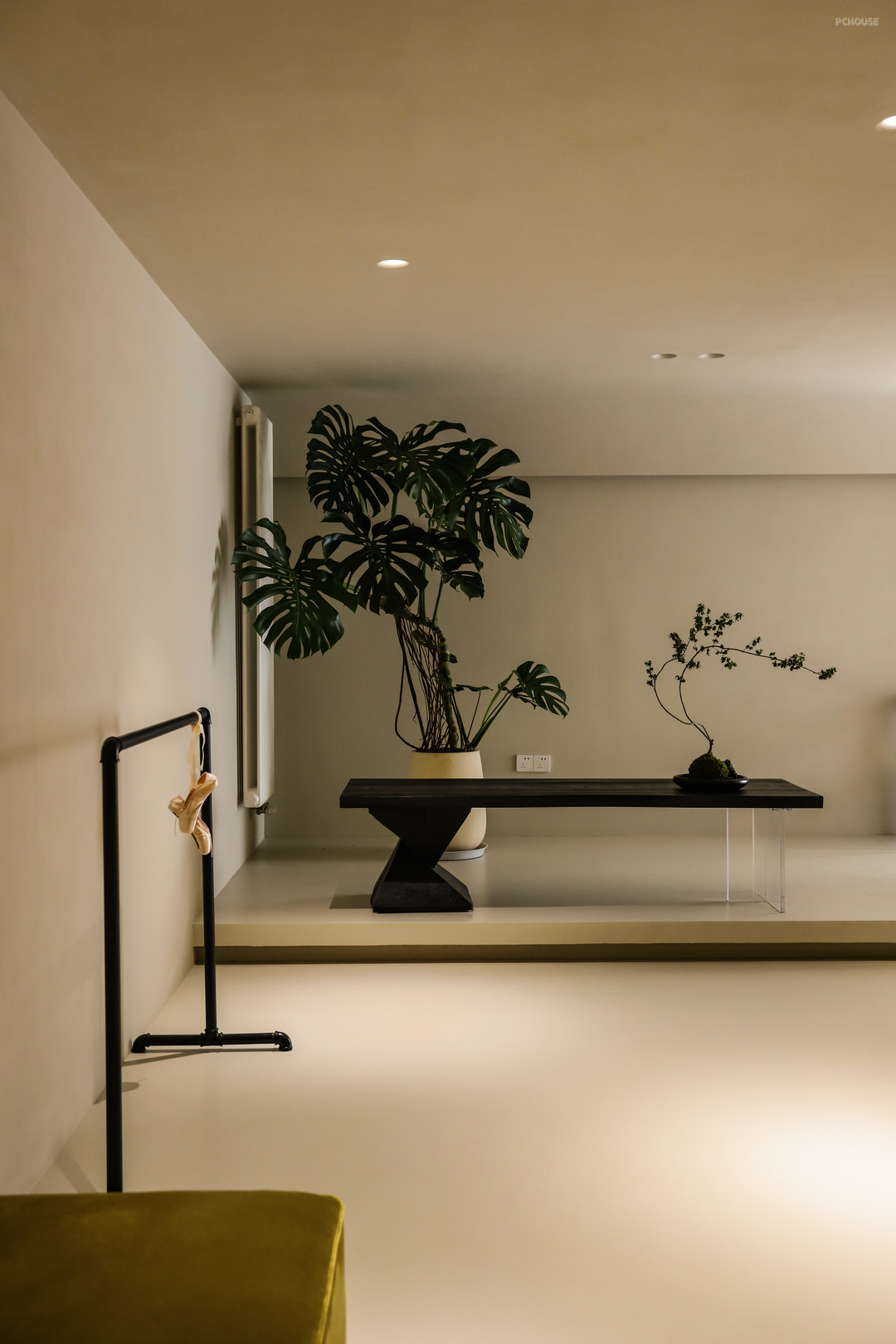 茶室的地台延伸到阳台,垭口和吊顶呼应做了弧形处理,这种弧线的过渡,在家里的很多地方都能看见,包括之前提到的石膏灯,后面在主卧、卫生间、衣帽间、儿童房都有这样的元素,它就像微水泥与生俱来的一种属性,象征着自然、有机、生命力。