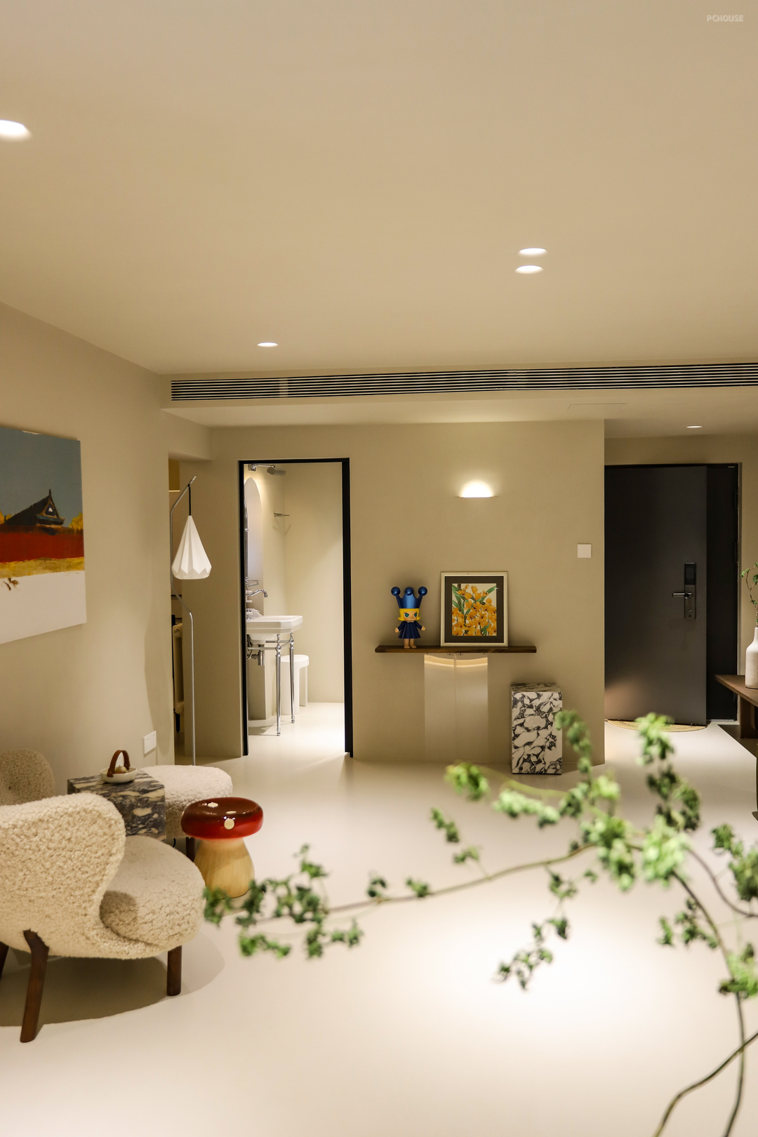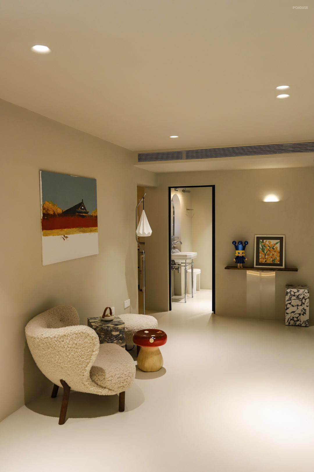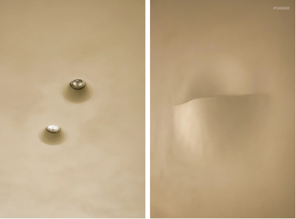 壁灯和内嵌射灯选的石膏款,需要提前预埋石膏本体,油工阶段和墙面一样的处理,这样就能达到和顶面和墙面融于一体的效果,过渡流畅,有一种自然有机感。