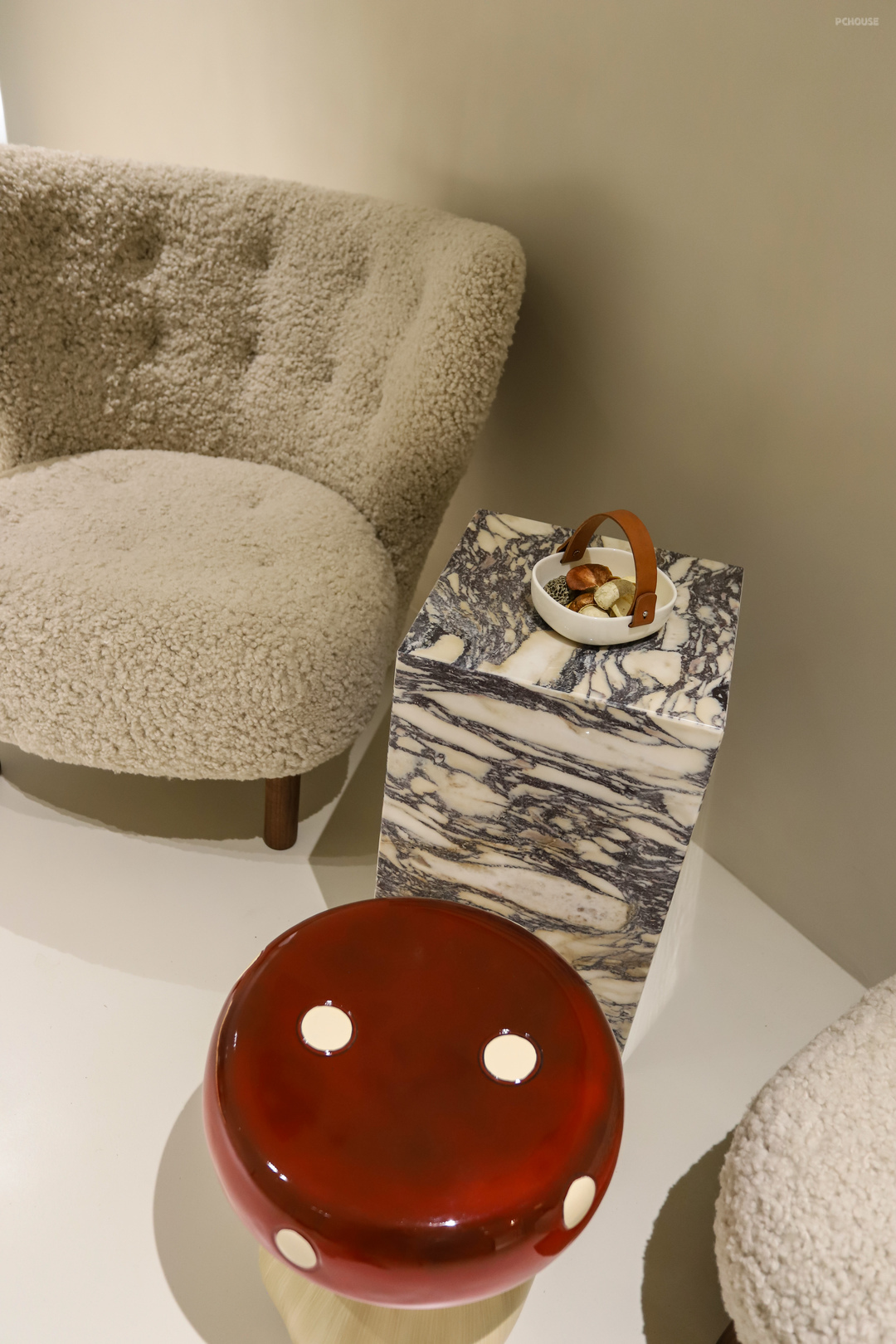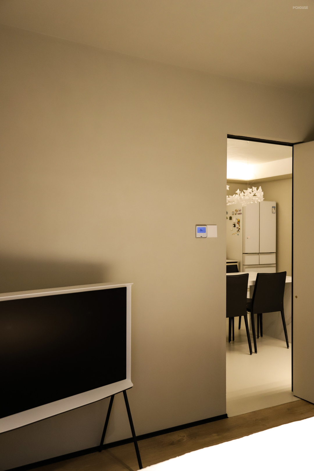 门厅进来就是客厅,主要是给娃做舞蹈拉伸用的,整个4.8*3.9米的空间尽量保持开阔通畅。只在一侧留了一组单人沙发供临时休息,沙发选的是Tradition的羊羔绒沙发,带脚凳,躺座着很舒服。墙上的挂画是爸爸亲自画的。落地灯是英国Original Btc的手工骨瓷钻石落地灯。