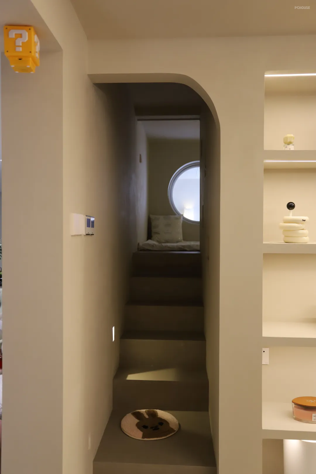 整个次卧空间做了双层设计,上半部分作为女儿房,登上楼梯到达自己房间,即使是平层也能住出复式的仪式感。钢结构搭建的楼梯和楼板,楼梯步宽600mm,对孩子来说刚好。最下面一级比较深,上楼梯也可以缓冲一下。楼梯侧面内嵌的地脚感应灯,能达到只见光不见灯的效果,也是要提前预埋的。