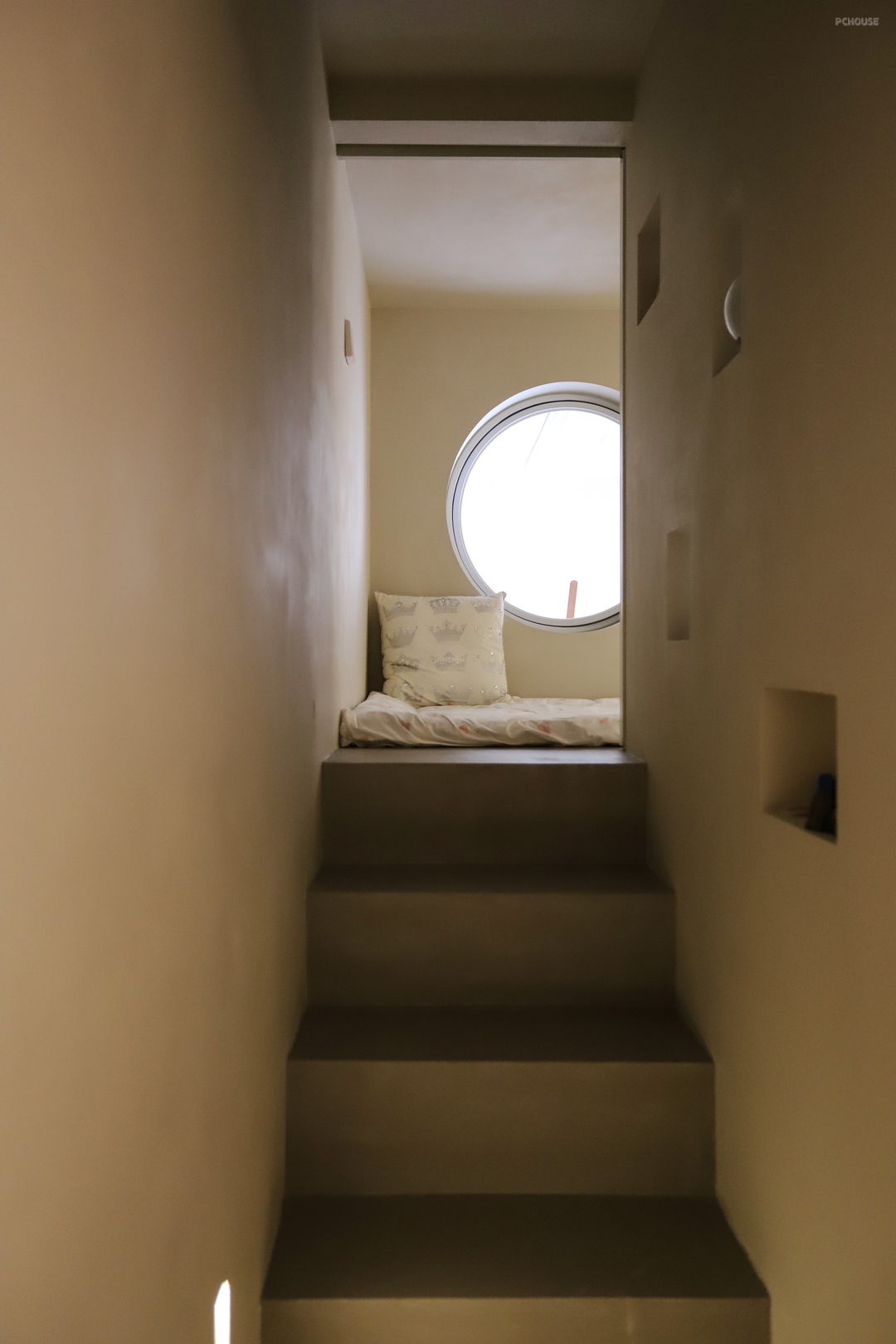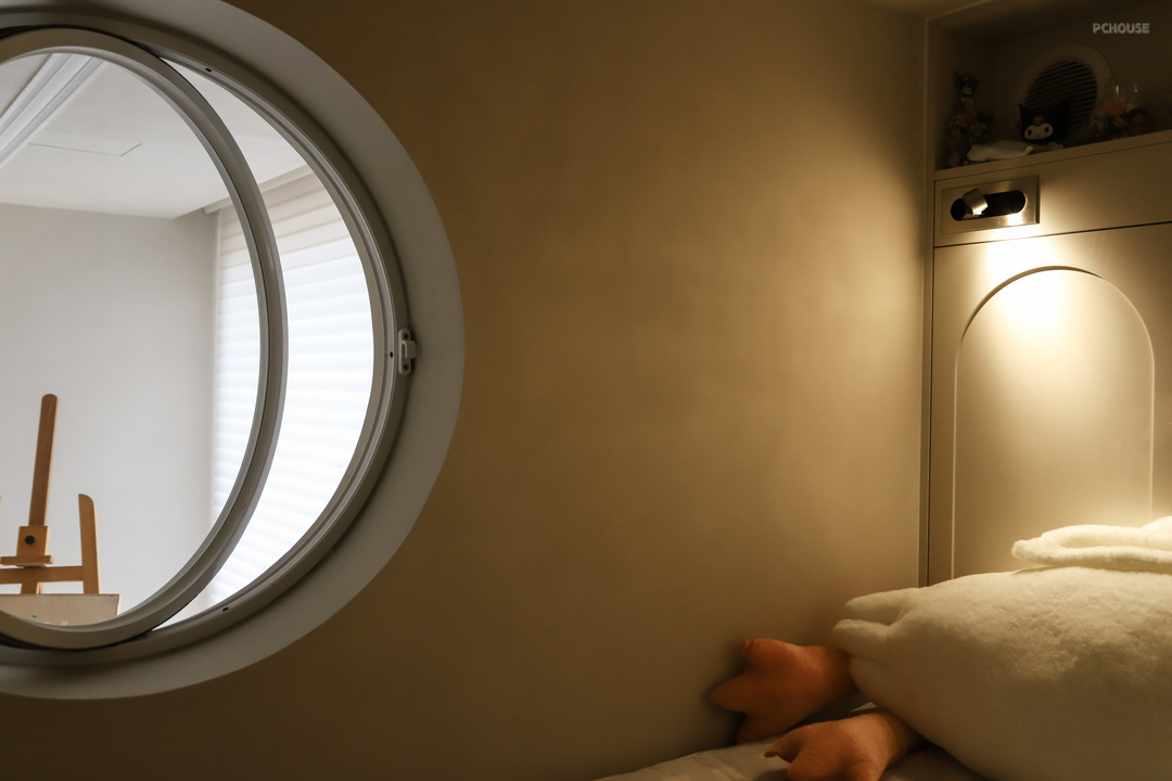 阳台与儿童房相连,窗洞变成了更有趣味也更柔和的圆形,加上定制的中轴旋转圆窗,既安全又有趣,好像一个太空舱。利用原来窗户下面的空间做成了壁龛式的储物架,用来放孩子的玩具以及画画用的颜料。