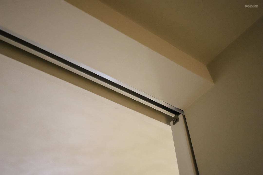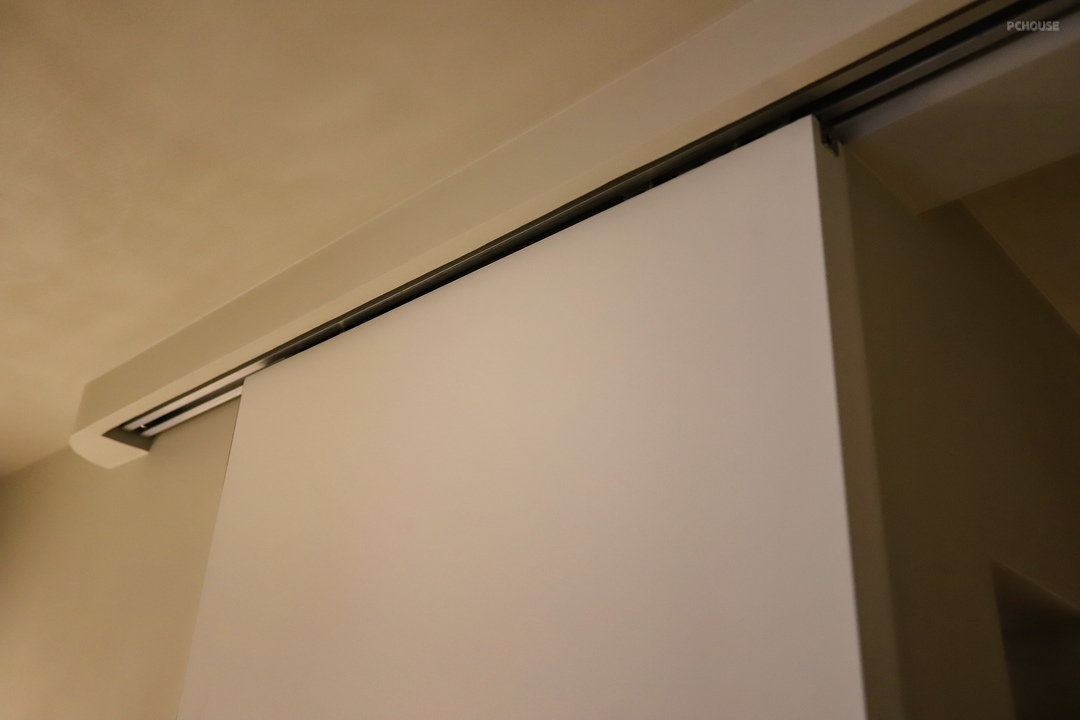 楼梯尽头安装了吊柜推拉门,孩子在上面也方便关门。为了让层高高些,这里是没有吊顶的,是用木工板做了一个盒子把推拉门的轨道隐藏了起来。