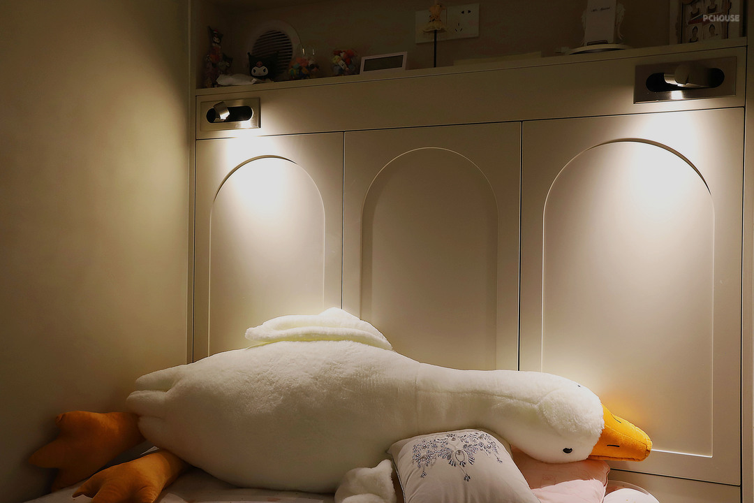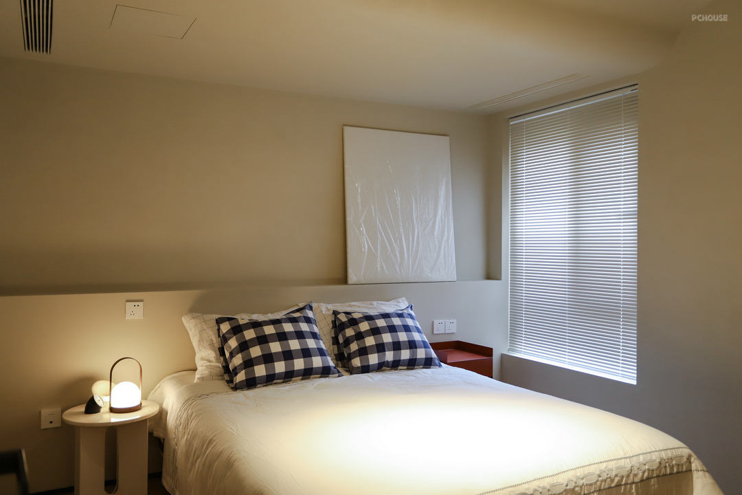上面睡觉的区域是2200*1400mm,床头做了进深200mm的床头柜,上面开放格放些零碎物件,还借主卧的中央空调,在这里也设置了一个出风口。左右两侧的壁灯是内嵌于柜体的,用的时候拉出来,还能调节角度。