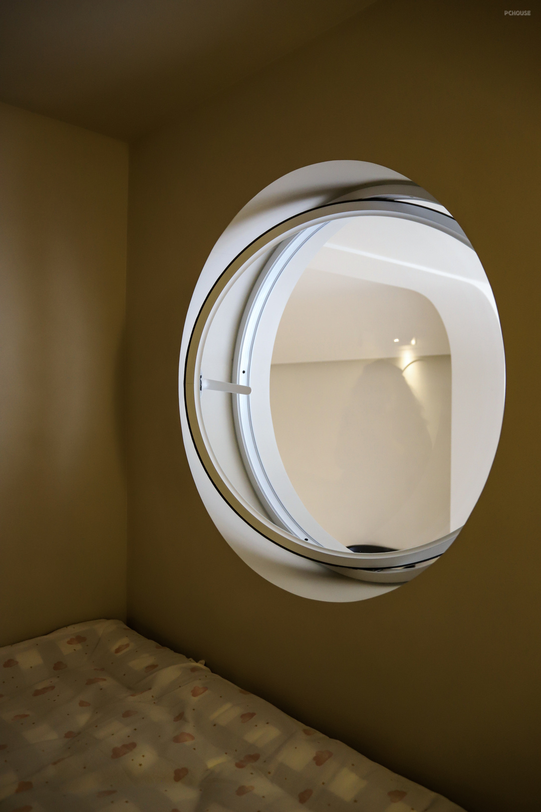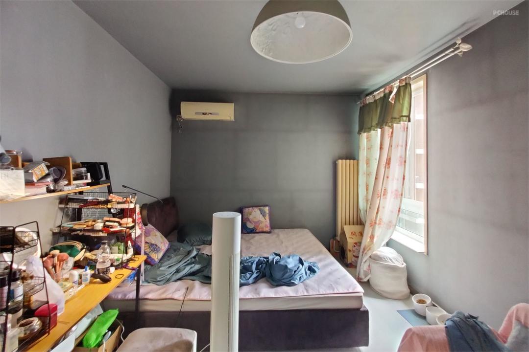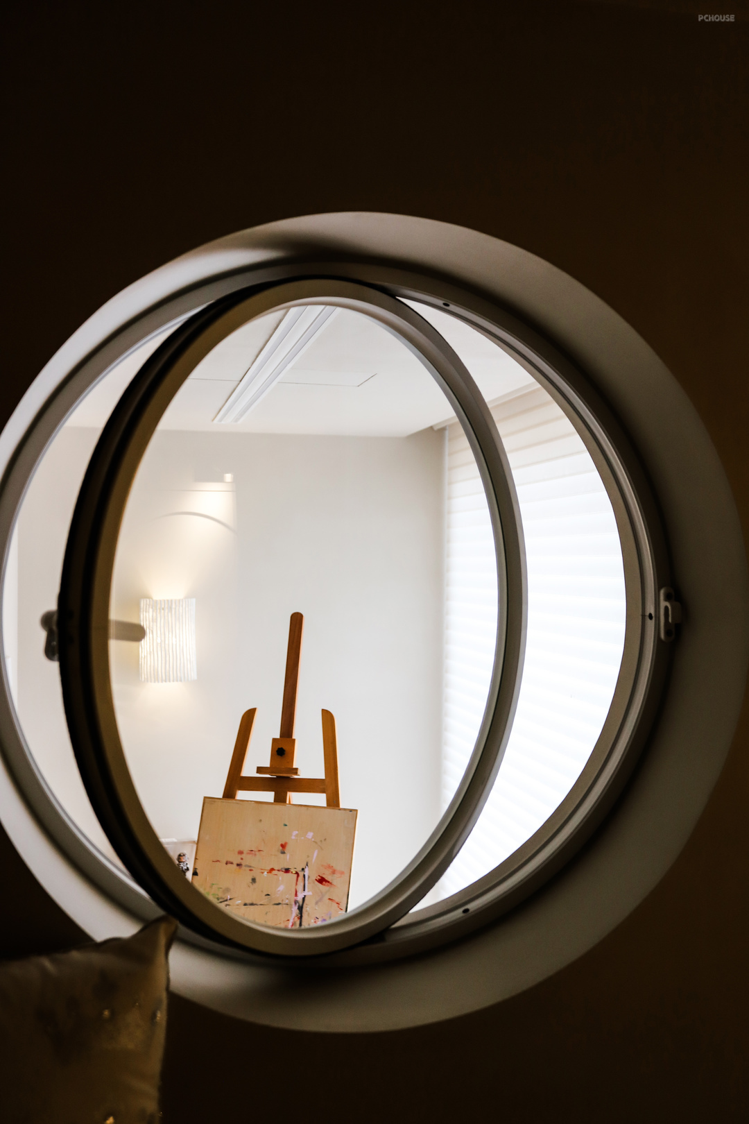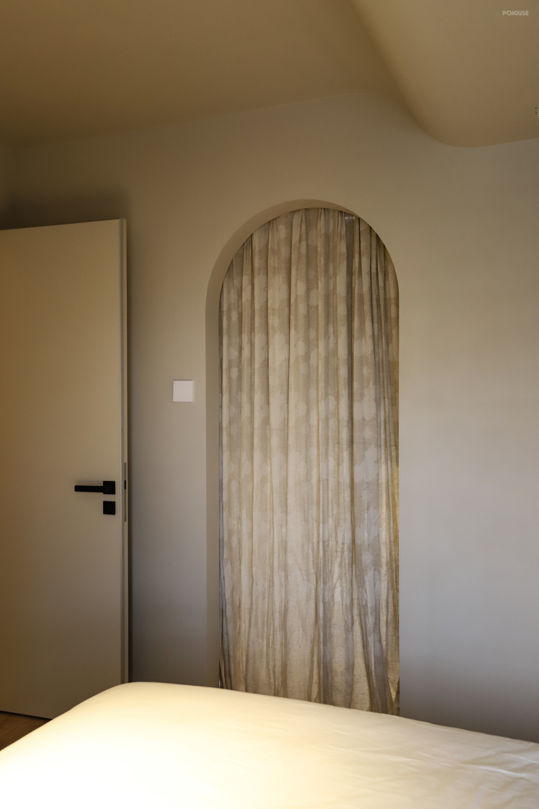 弧形圆窗为次卧提供了绝佳视野,能看到整个阳台,手伸出去就能够到窗帘的遥控器,感觉整个阳台都在自己的掌控之内,关上窗和门,这里就是自己的私人城堡,非常有安全感。