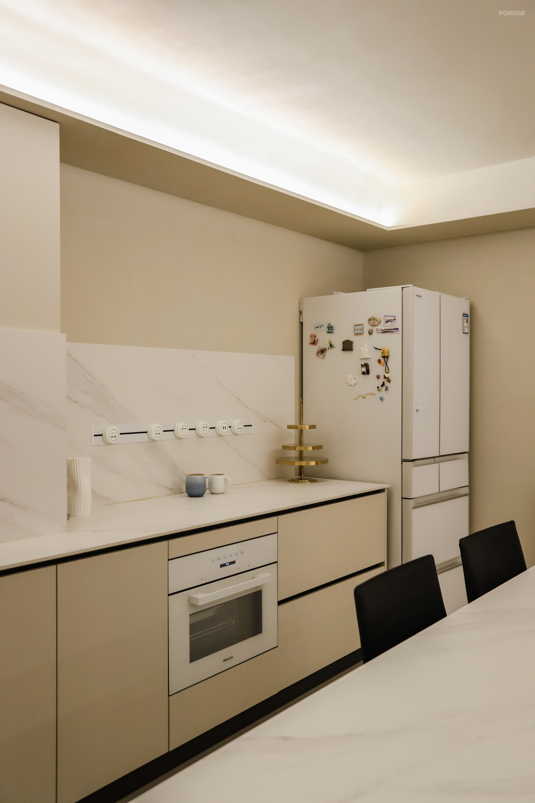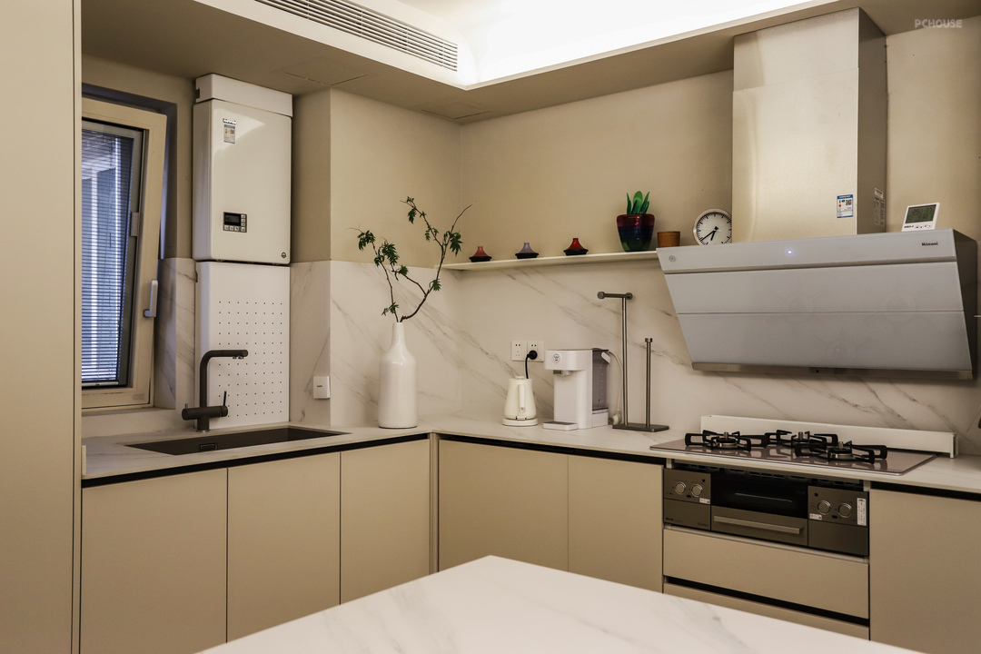压缩了部分主卧空间给外面,现在的餐厨区变得方正完整,整个区域只有原来厨房仅有的一扇小窗,显然,一个开放无遮拦的空间才能最大化利用这里的采光。L型的操作台面长达5.8米,在满足洗切炒的同时,还能兼做餐边柜、电器区。