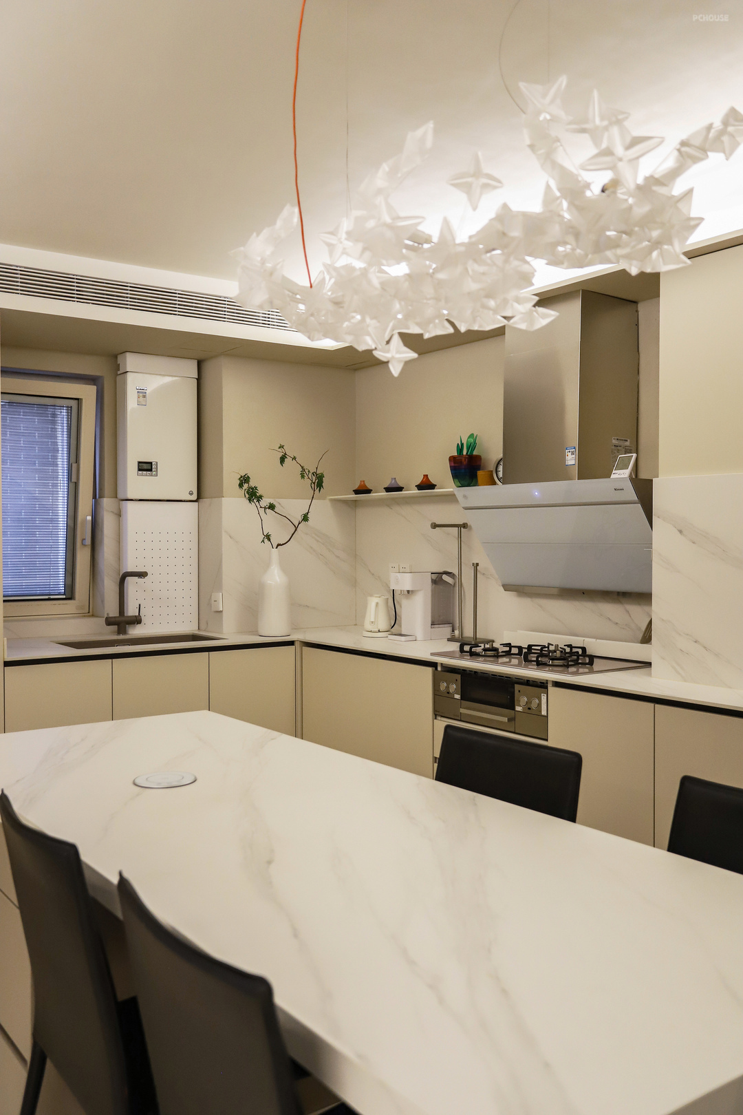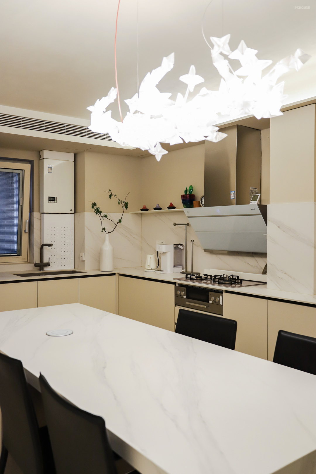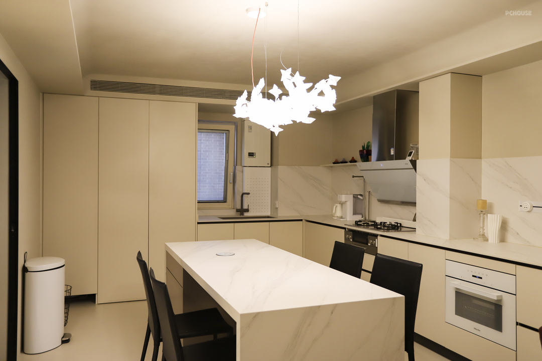 餐厅是一个800*2200mm的定制中岛,和厨房台面用的一种岩板材质,围绕它在厨房和餐区之间形成洄游动线。虽说是岛台,其实是正常餐桌的高度,餐桌下方还有一组背靠背的抽屉柜,两边都能使用。桌面上还安装了升降插座,吃火锅啊或者要在这办公的话,按个按钮,插座就能升上来,还是蛮方便的,不用的时候收起来也不会碍事。餐厅吊灯选的是意大利的Slamp Hanami,时尚又简约。