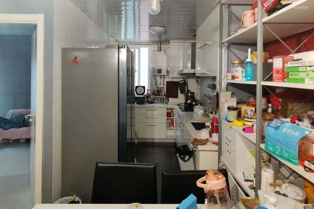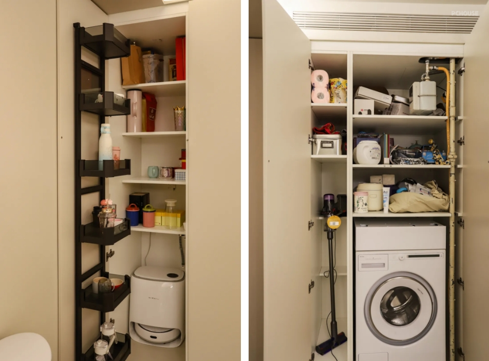 水槽旁边的三组高柜,是家政+储物柜,为了能藏住原来的燃气管,加深做到了700mm。这个深度的柜子其实是不太好用的,东西比较难拿,左边那个储物柜,我们把里面层板内推,在柜门背面挂了一组薄架,这样就相当于把储物空间分成两部分,用起来更方便。下面是扫地机器人,提前做好了上下水,安装起来就很容易。柜门抬高了12公分,方便机器人出来。
