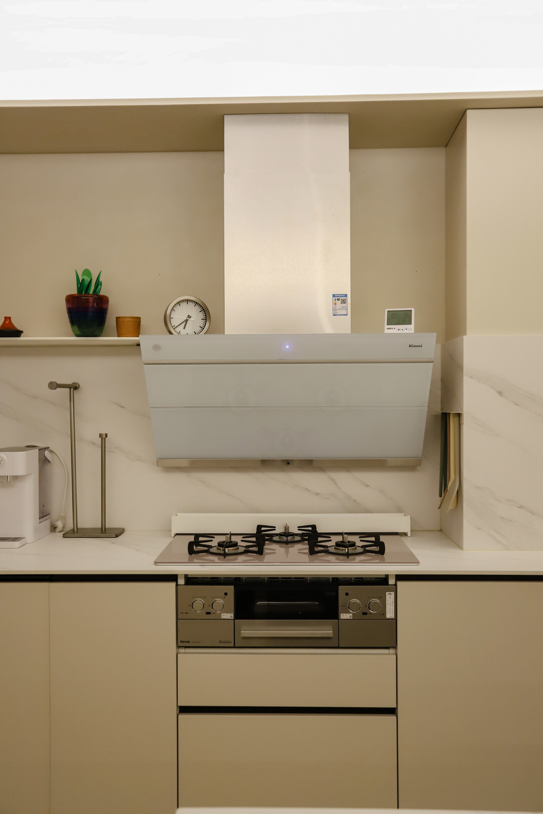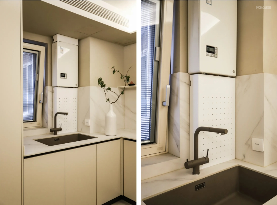 灶台是三眼灶,带小烤箱,颜值功能兼备。铂浪高的这款水槽龙头,合并了净水龙头的功能,可以直接放出净水。因为有的净水龙头是另购的,和水槽龙头不配套,放在一起就会违和不美观,这款就能很好的避免这个问题。
