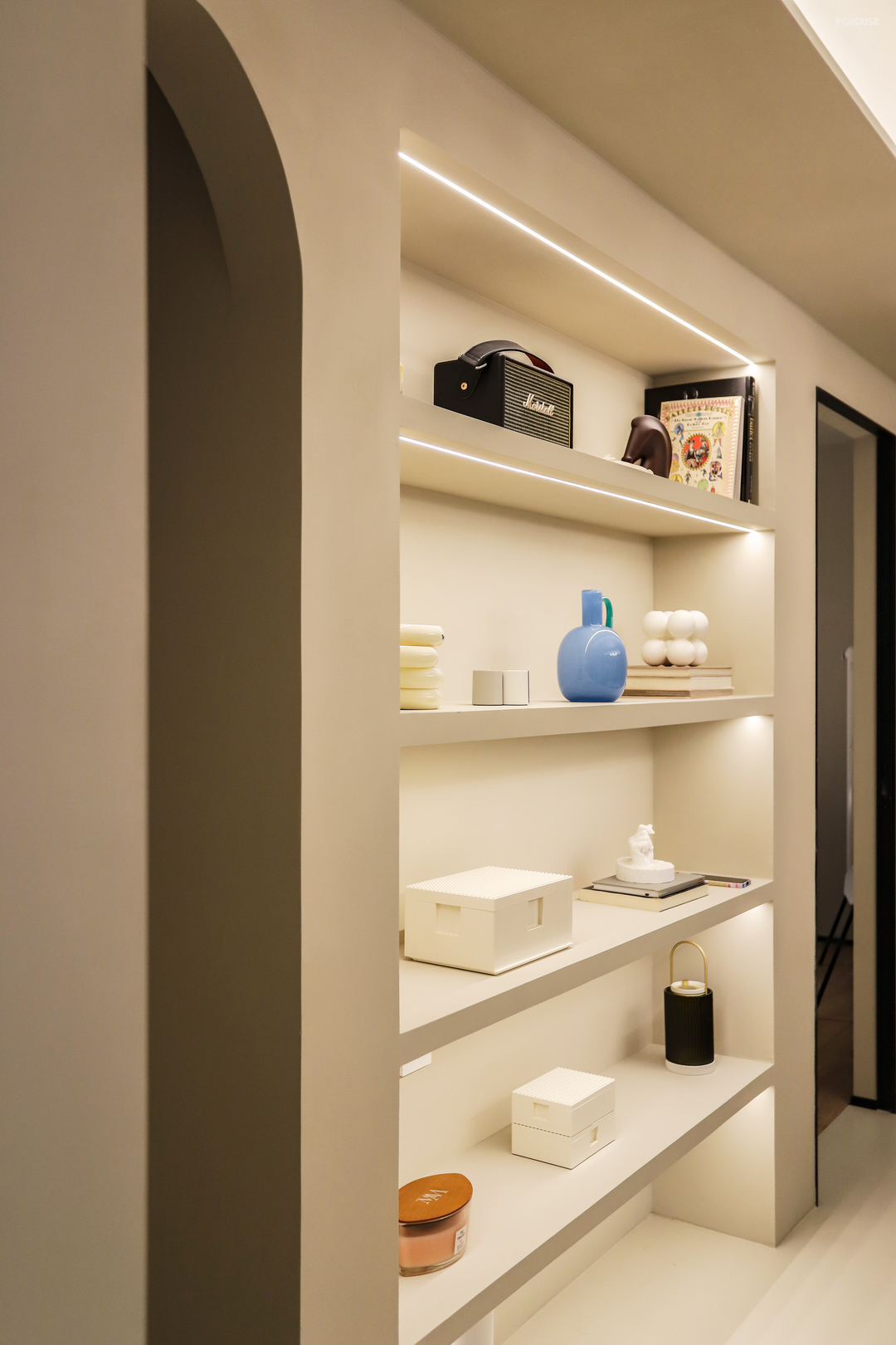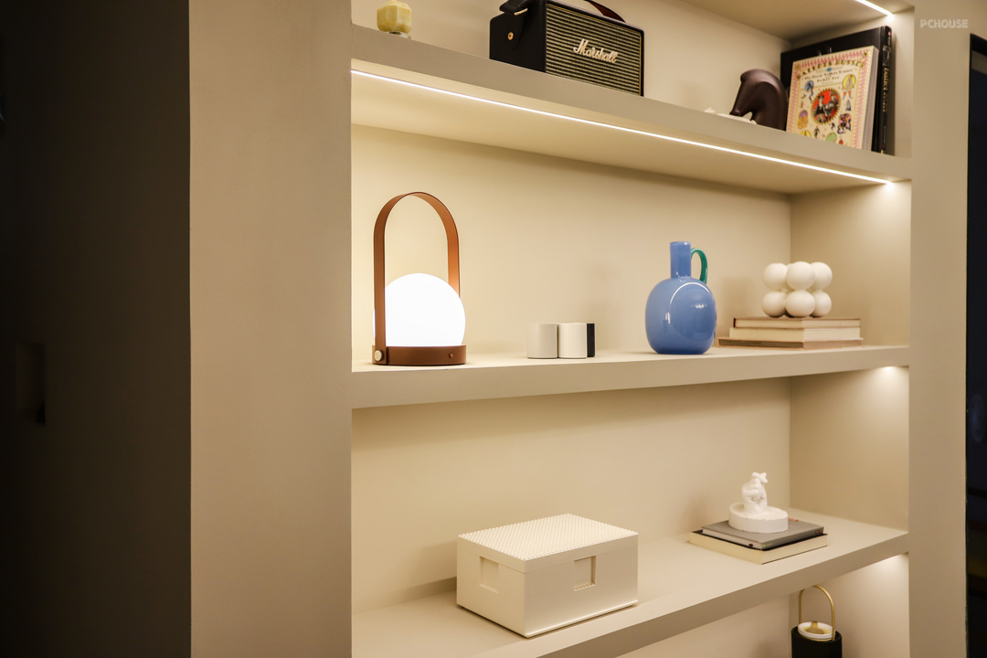 两门洞之间,借用了卧室衣帽间的空间,做了一个长1400mm,深300mm的展示架,直接用木工板做的层板,再用石膏板封面,同样做微水泥饰面,与整体和谐统一。底板开槽做了内嵌灯带,这样能获得更好的展示效果。