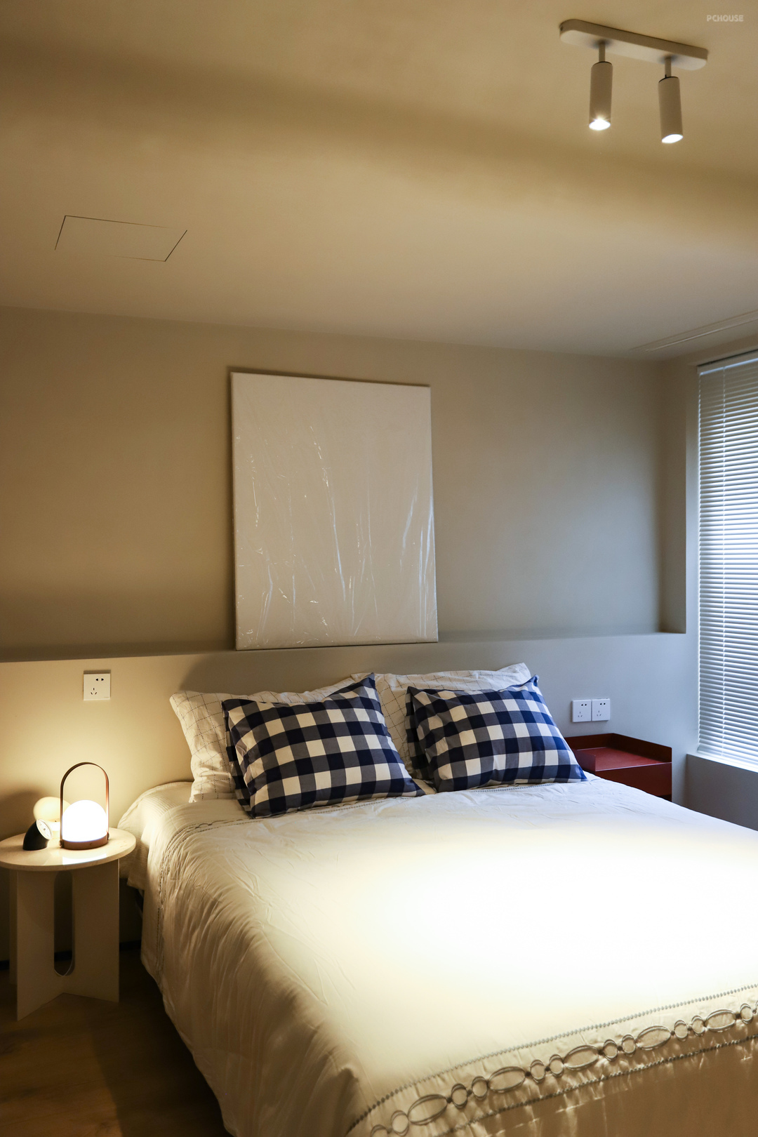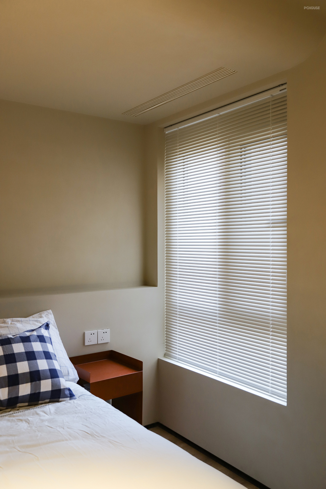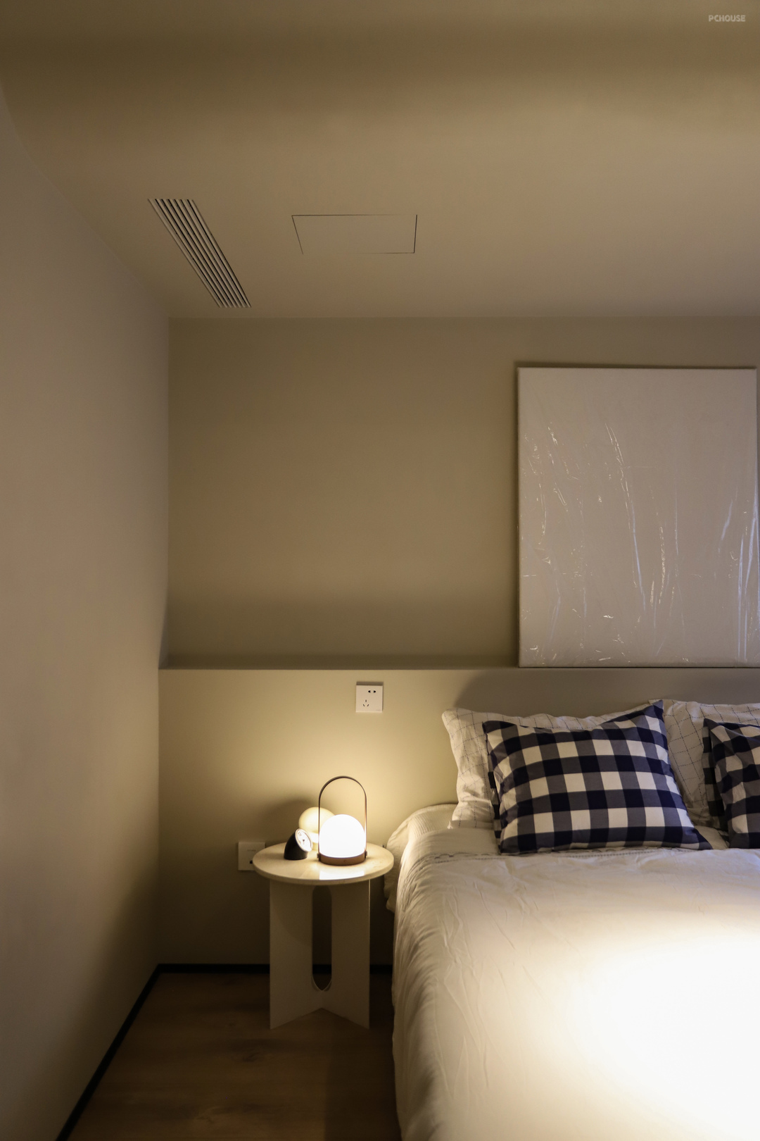 为了把空调机器藏起来,床头处做了局部吊顶,过渡部分也是用了弧线来弱化落差的生硬感,让空间变得流动而柔和。吊顶两侧做了出回风口,也是用的内嵌式的,不会看到粗粗的边框,更极简。检修口用的也是隐形款,只能说是尽量降低这些丑东西的存在感。