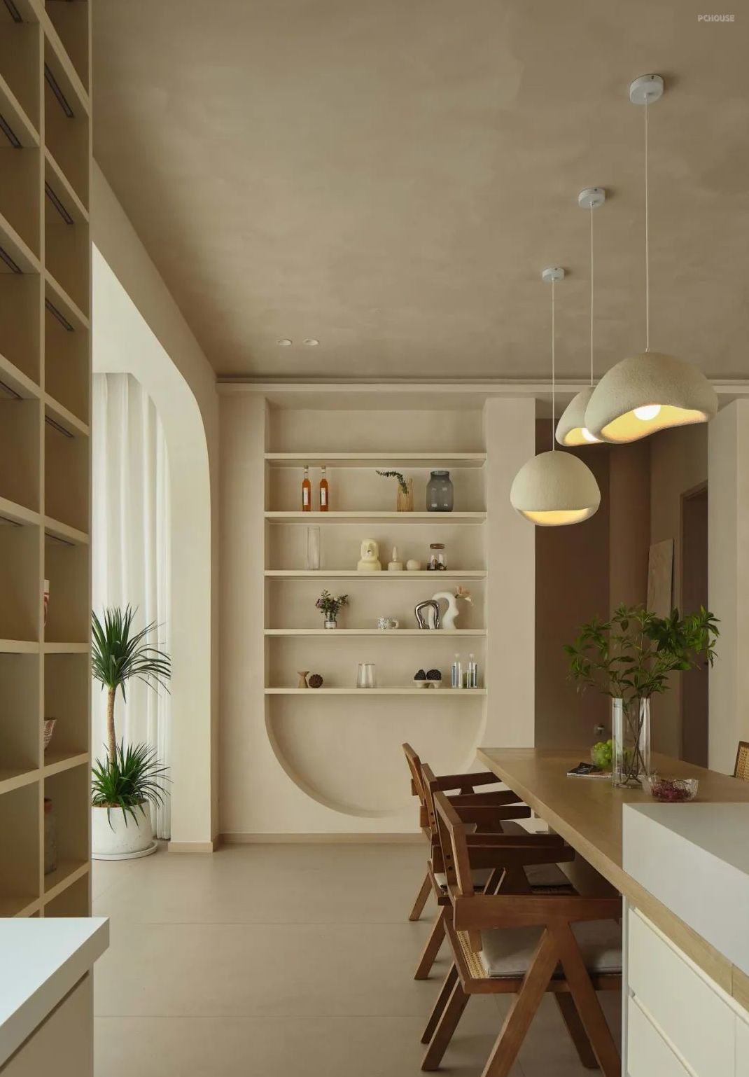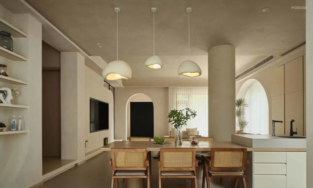 餐厅的核心是一张2400米长的餐岛台,它的设计简约而别致,充满了侘寂风格的美感。餐岛台顶部悬挂着吊灯,为用餐区域增添了柔和的灯光,营造出一种温馨和浪漫的氛围。
