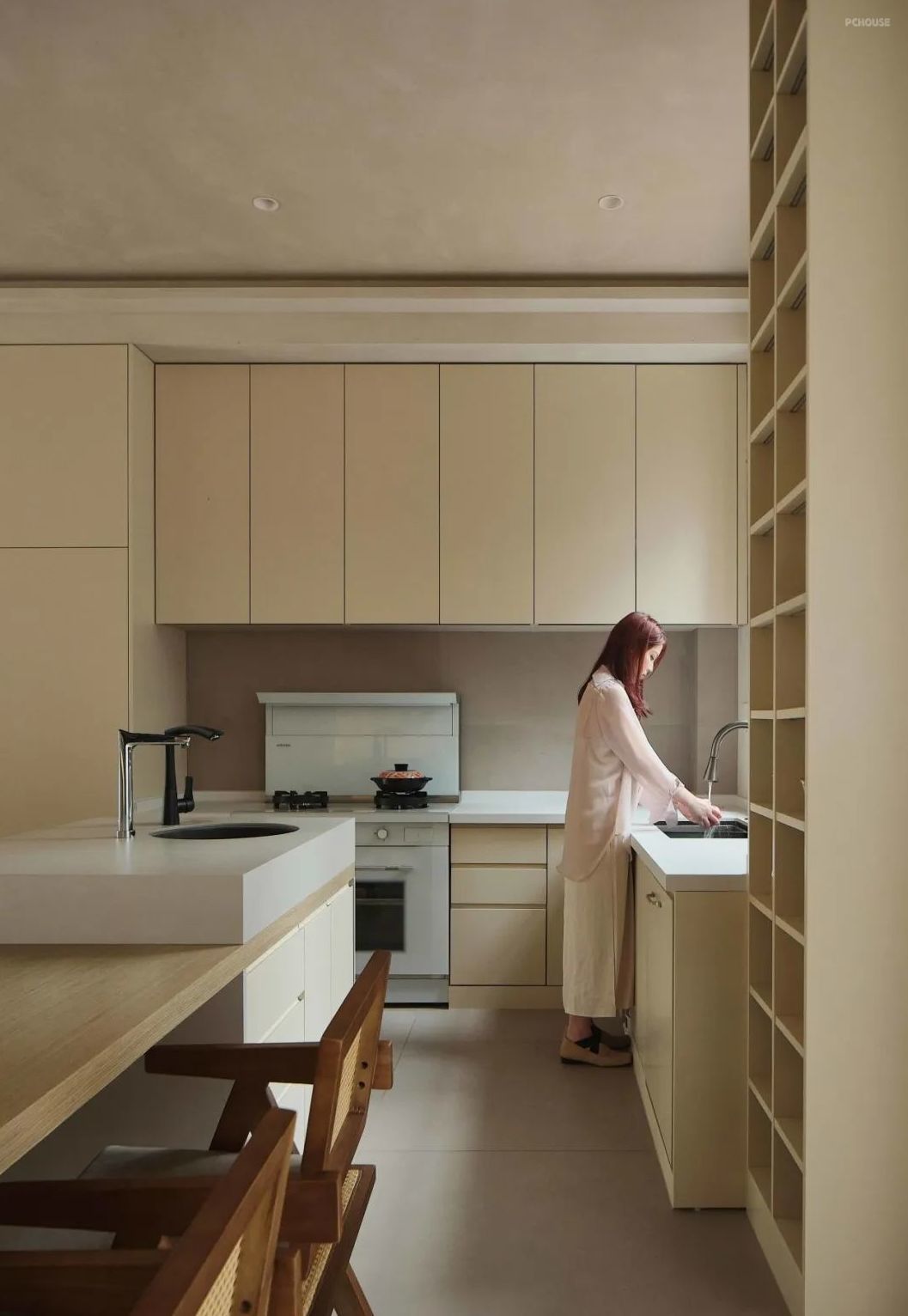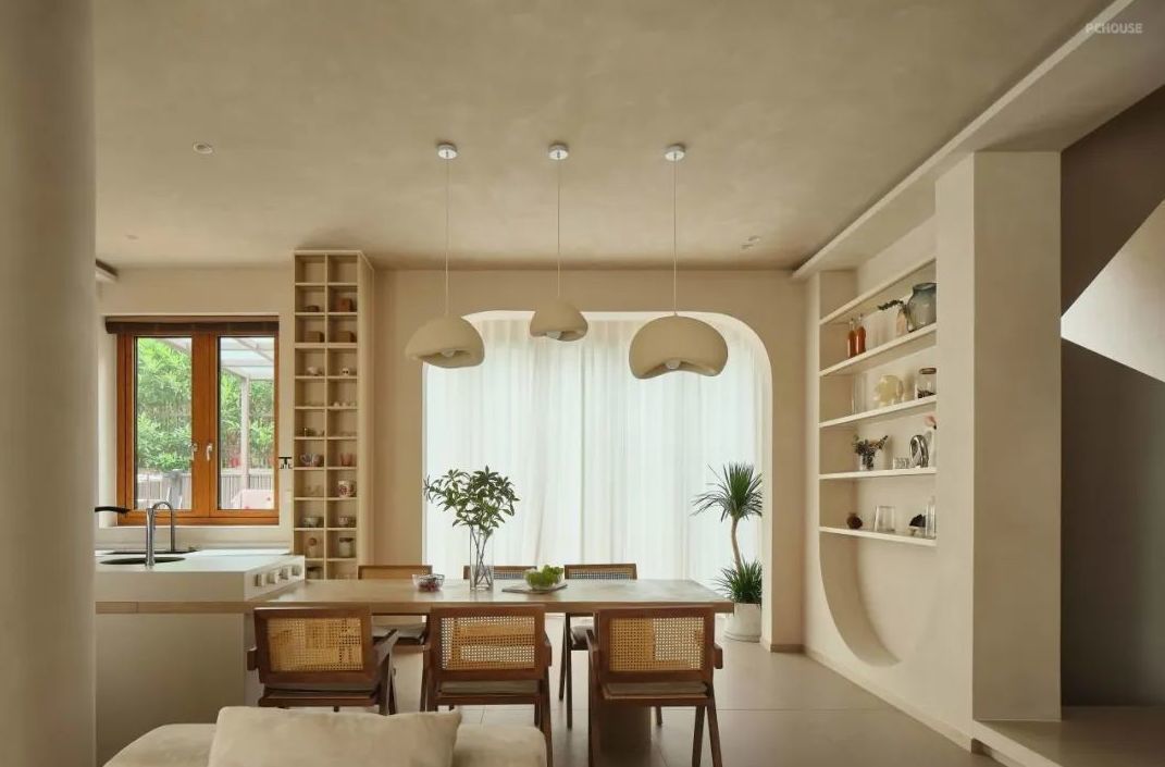 厨房是一个开放式厨房,充满了自然的色调和质感。整个空间的柜门全都是烤漆的,颜色都是奶咖色,和整个空间色调一致,展现出一种朴素而温暖的氛围。厨房台面上的集成灶,洗碗机,蒸烤箱等设备都被巧妙地隐藏在柜体之中,保持了整体空间的整洁和简约。